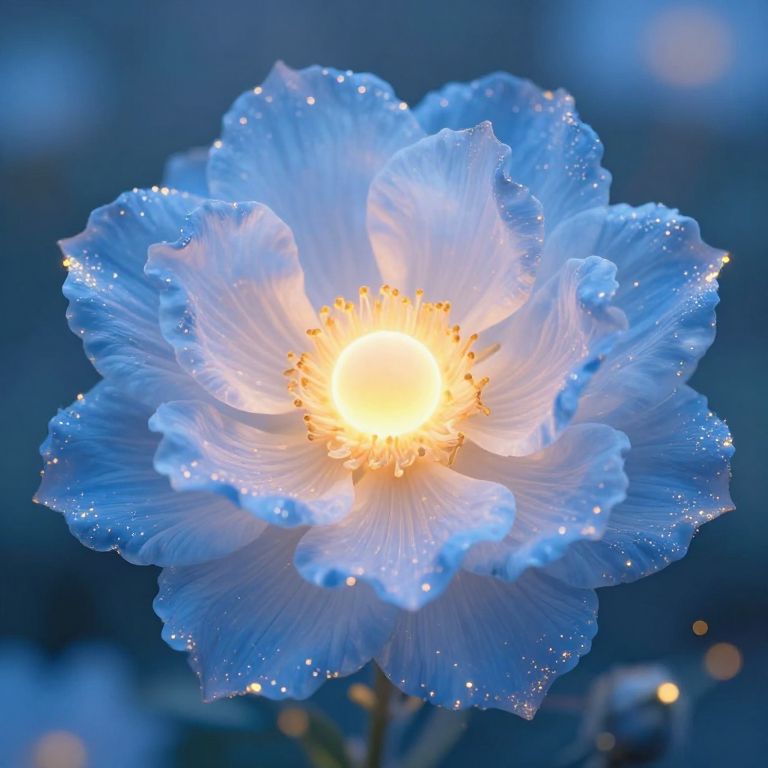 Radiant petals of a surreal flower bloom outward, their ethereal blue hues dusted with golden specks, encircling a luminous core that glows like a miniature sun, set against a dreamy backdrop of bokeh lights.