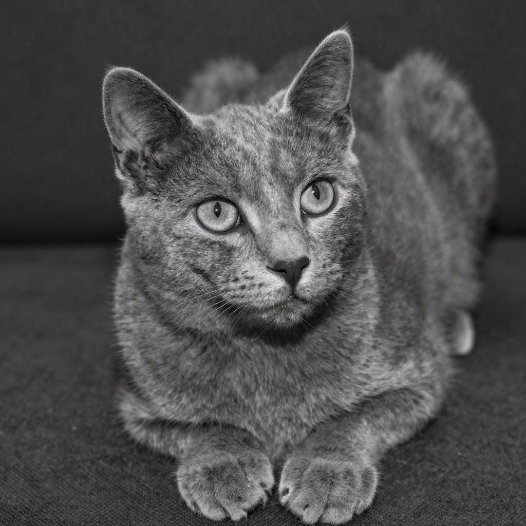 This black-and-white photograph captures a close-up of a gray cat with large, expressive eyes, lying on a dark, textured surface. The cat's fur is short and smooth, and it's looking slightly to the right. The lighting is soft and even, highlighting the cat's features without harsh shadows. The camera angle is slightly above eye level, and the depth of field is shallow, blurring the background to keep the focus on the cat.