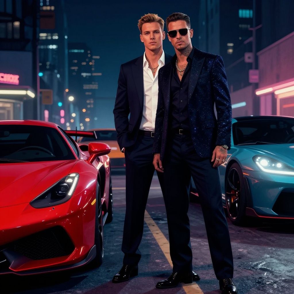 Photograph of two stylish men in black suits standing confidently on a neon-lit city street at night, flanked by a red and blue sports car