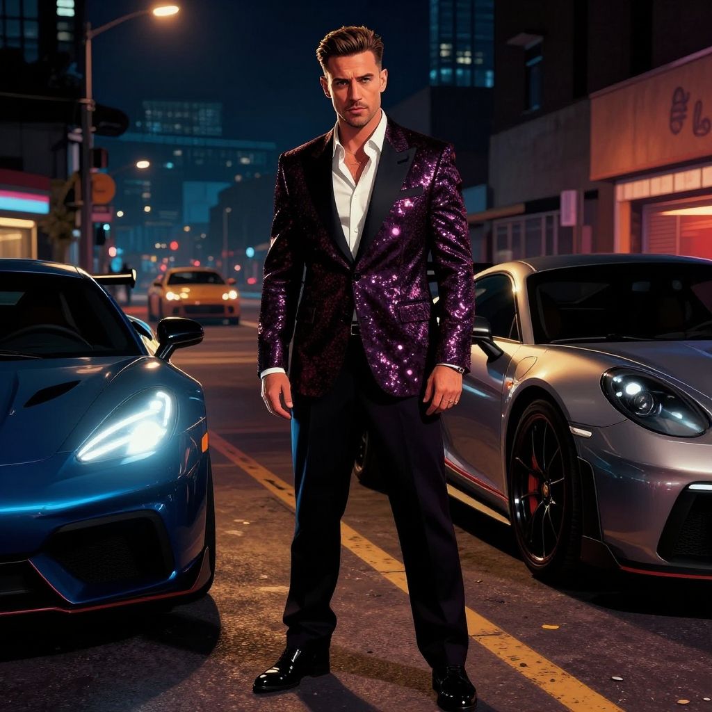 Andrew Tate GTA scene, gritty city streets at night, sleek sports cars, flashy suits, dramatic lighting, stylized comic book style, vibrant colors, cinematic action