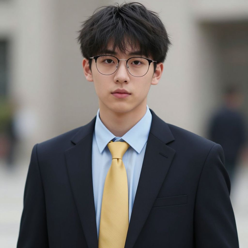 Photograph of an East Asian young man with black hair, glasses, wearing a black suit, light blue shirt, and yellow tie, standing outdoors with