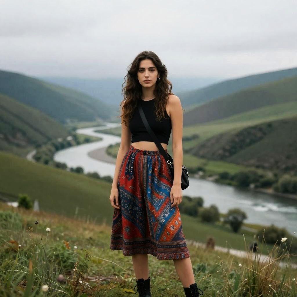 Photograph of a young woman standing on a dirt path in a lush, mountainous forest. She has wavy brown hair and a light tan skin tone. She's wearing a black crop top, colorful floral skirt with a sheer overlay, and black combat boots. The background shows tall pine trees, colorful wildflowers, and a slightly overcast sky. She looks directly at the camera with a confident expression.