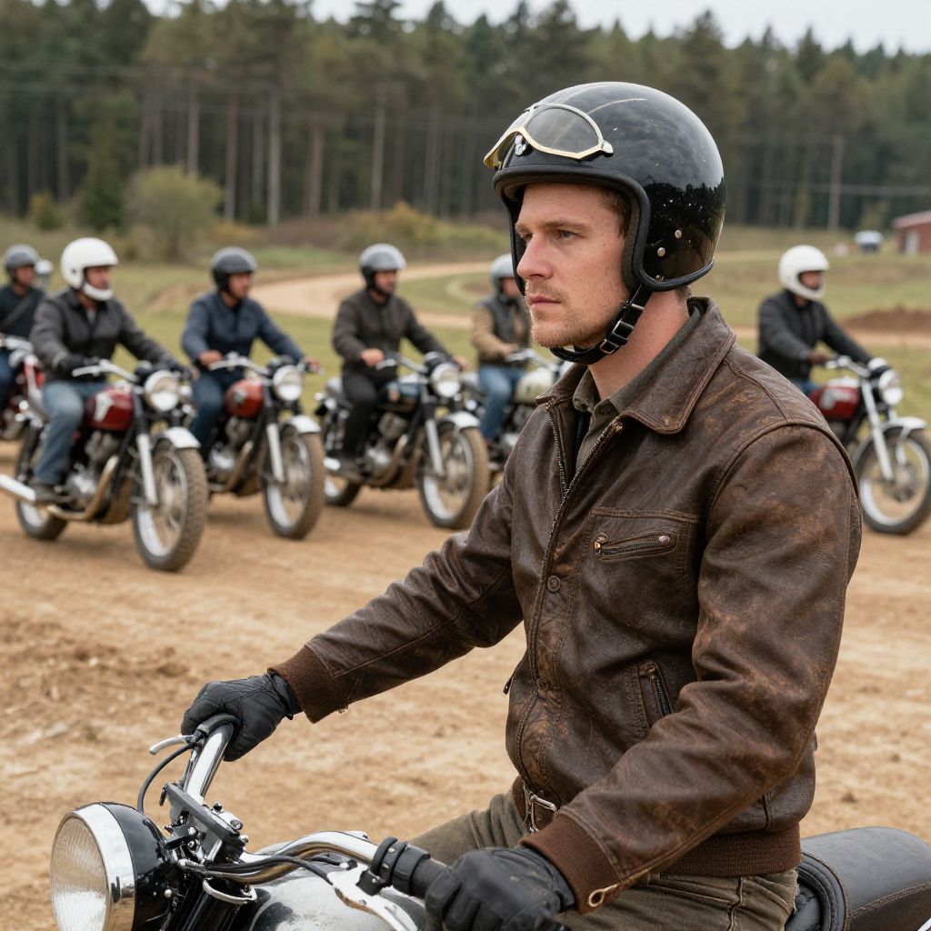 A focused man wearing a vintage motorcycle helmet and leather jacket stands in the foreground of a dirt track, where a group of motorcycles and riders gather in the background. The scene evokes a classic, rugged style reminiscent of retro motorcycle racing culture, set against a forested landscape.