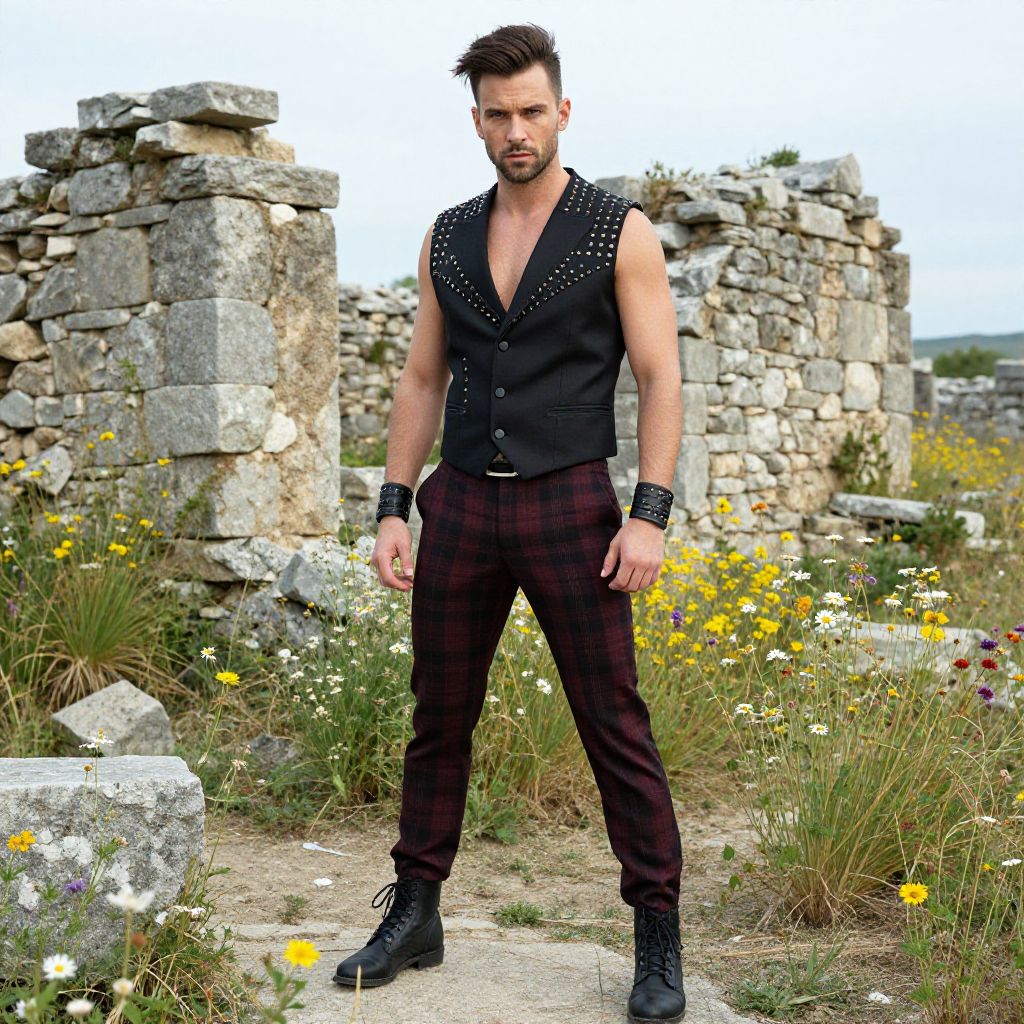 A man, rebellious vibe, matte black studded vest, burgundy and black plaid pants, lace-up ankle boots, leather wristbands, ancient stone ruins, vibrant wildflowers, whispering winds, cinecolor, confident expression. Man has masculine face and piercing eyes