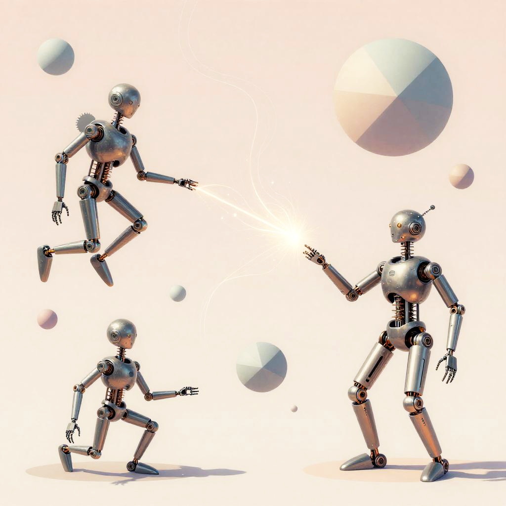 AI generated illustration depicting a surreal dreamscape where mechanical creatures interact with floating geometric shapes and ethereal light trails, soft pastel tones mixed with metallic textures, intricate design, imaginative and abstract composition.