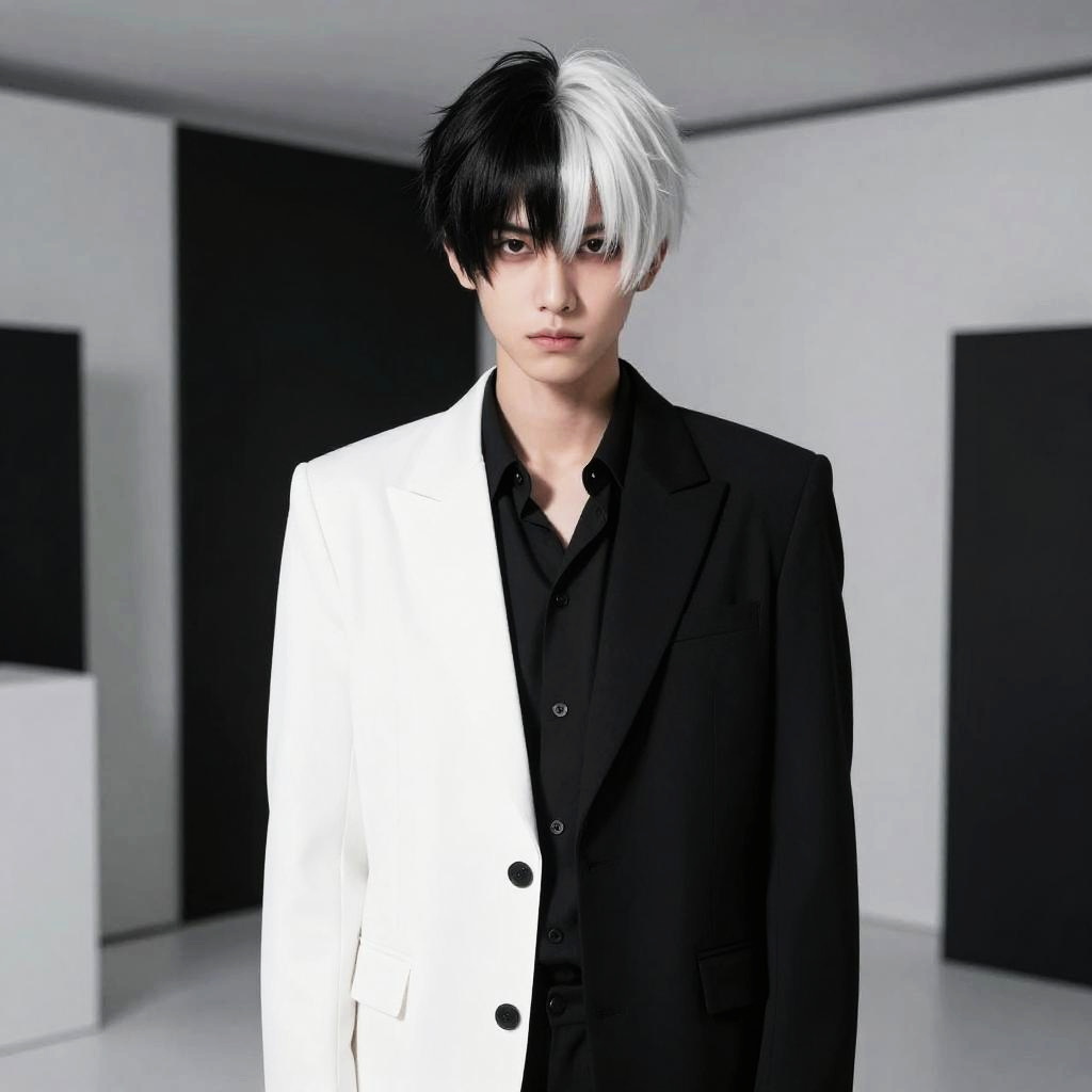 A portrait of a person with half black half white hair, split perfectly down the middle, wearing a modern black and white suit, standing in a minimalist monochrome room with geometric patterns, strong contrast lighting emphasizing the hair colors vividly.