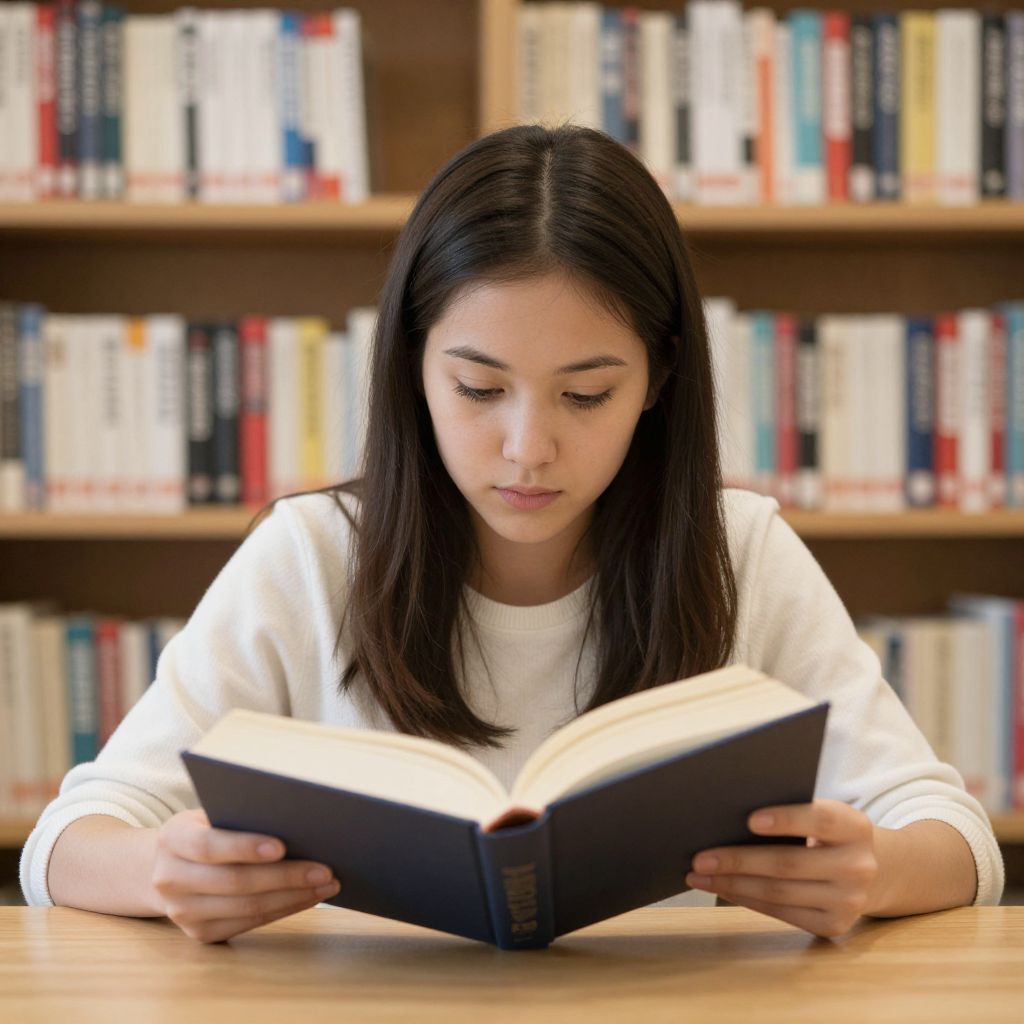 Focused young woman engrossed in reading a thick hardcover book, her hands gently holding its pages as she sits at a wooden table surrounded by a backdrop of neatly organized bookshelves filled with colorful spines.