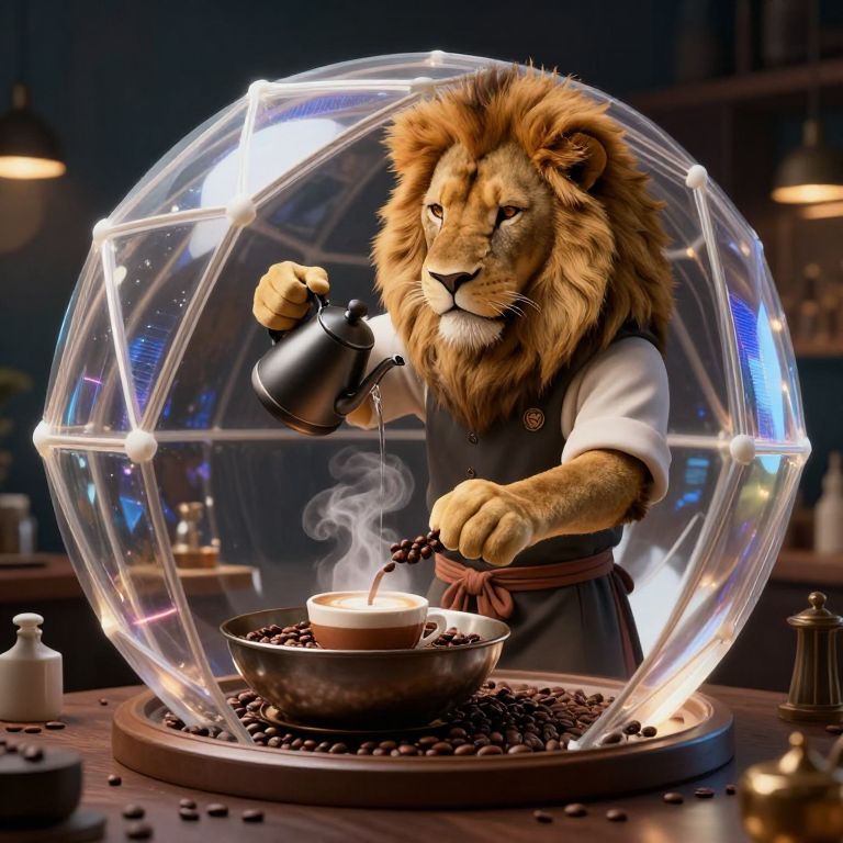 A barista lion wearing a coffee-latte kilt roasts beans inside a geodesic orb of solar winds, brewing elixirs to dreams in a steaming chalice.