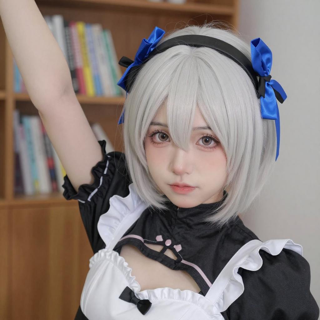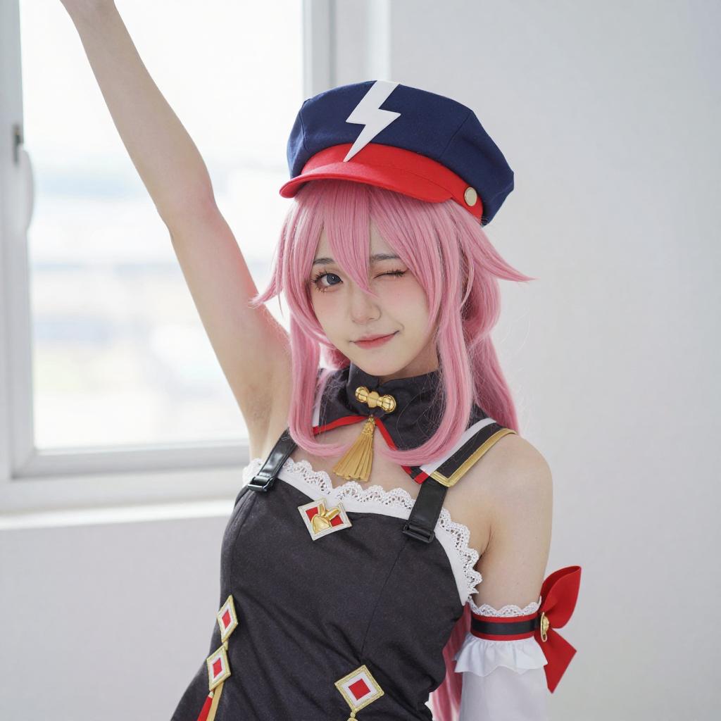 Photograph of a pink-haired anime-style cosplayer with blue eyes, wearing a pink bow and heart-shaped brooch, raising her left arm and touching her chest with her right hand. She has fair skin and a playful expression. The background is a plain white wall and wooden floor.