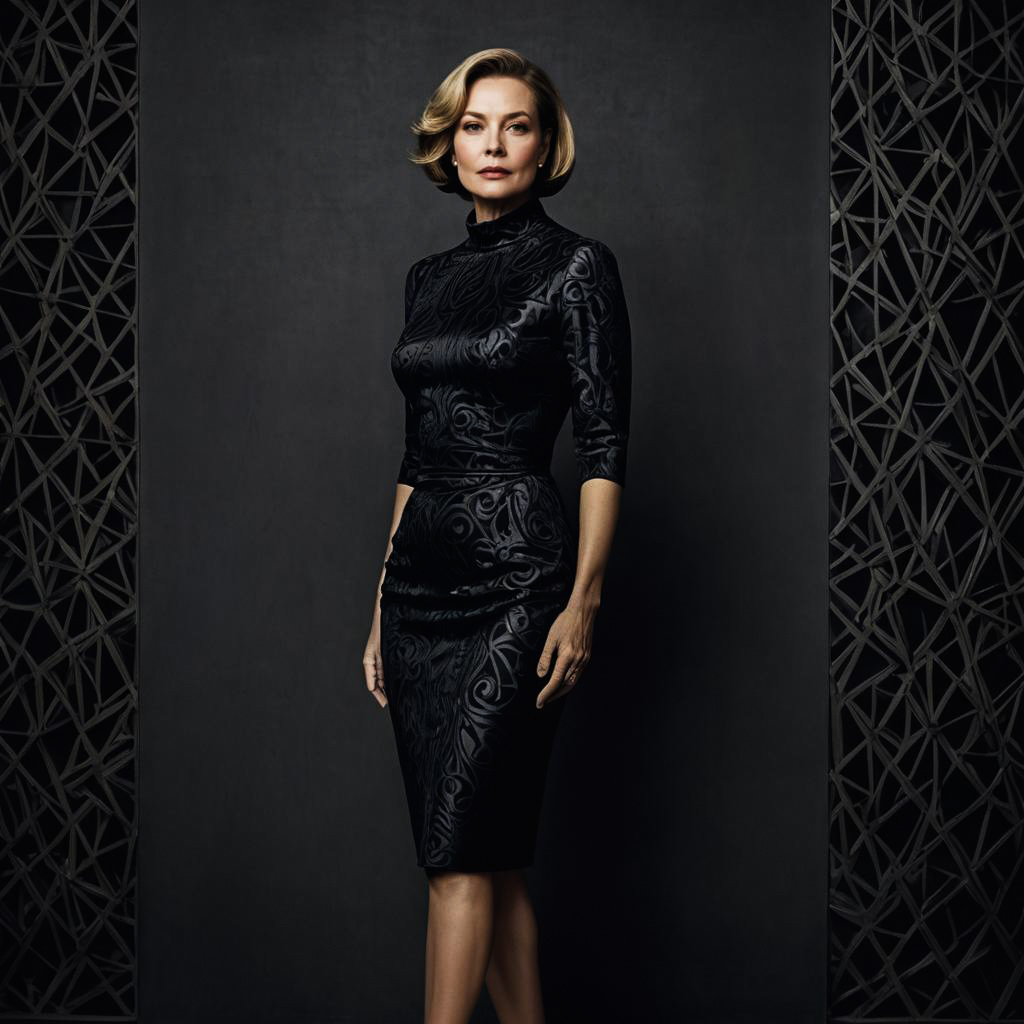 Portrait of a poised middle-aged woman with a short bob hairstyle wearing a sophisticated black bodycon dress with intricate velvet drape patterns. She accessorizes with an elegant pearl necklace, matching earrings, and rings. The photo is taken against a dark, textured studio background, highlighting her confident and composed demeanor.