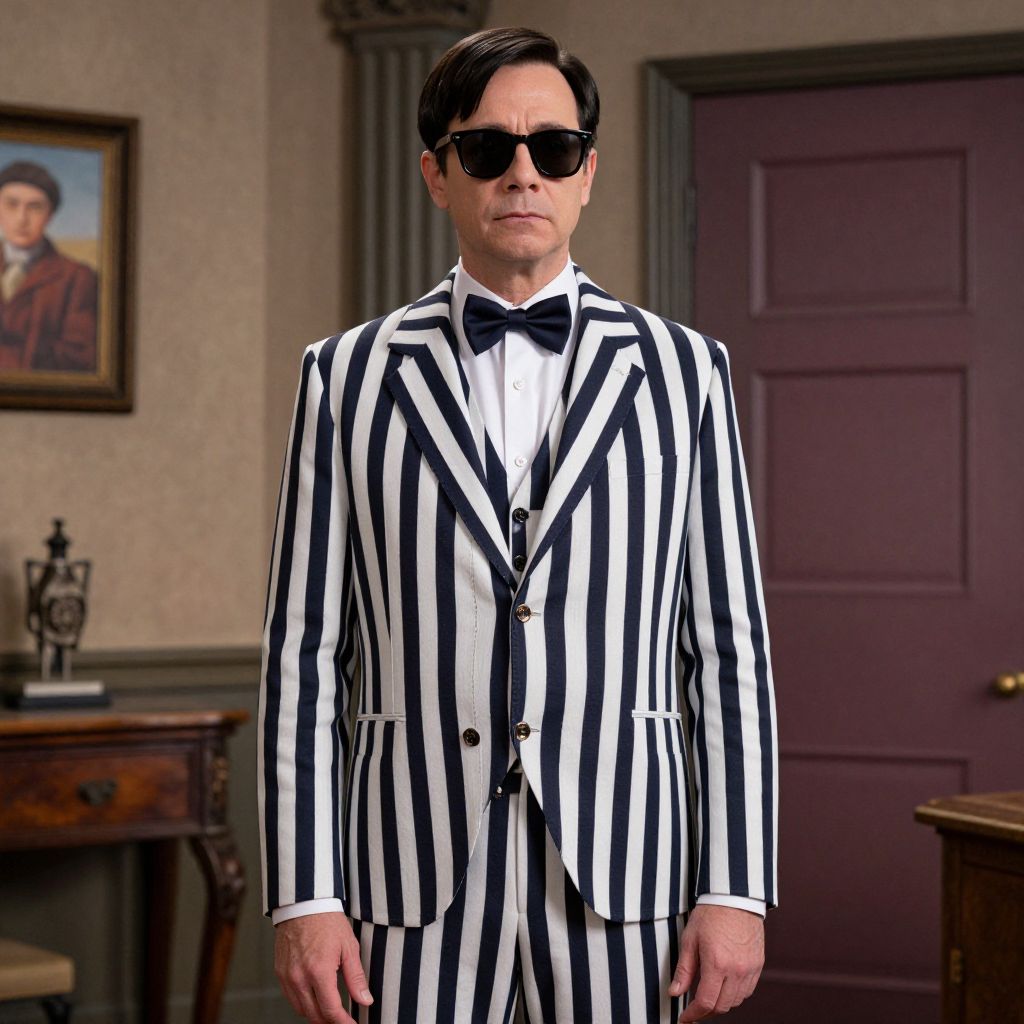 Photorealistic CGI of a man in a black-and-white striped tuxedo, black bow tie, and sunglasses, standing in a vintage room.