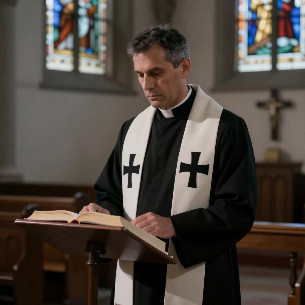 A serious-looking middle-aged man with short dark hair, wearing a black clerical robe and white stole with black crosses, stands in a dimly lit church. He holds an open book on a lectern, with stained glass windows and a cross on the wall in the background.
