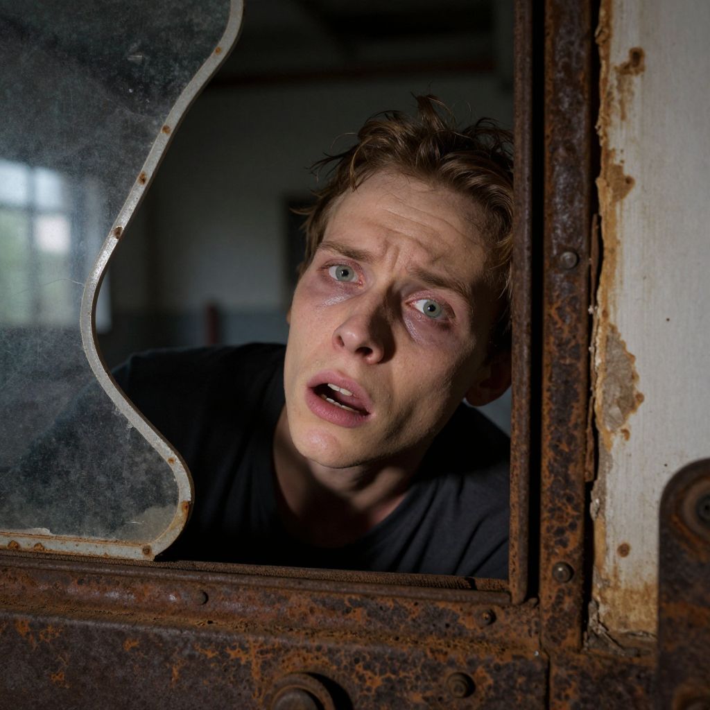 Photograph of a Caucasian man with short, tousled brown hair and pale skin, peering through a rusted, broken window with a jagged edge. His wide, blue eyes and slightly open mouth convey a startled or fearful expression. He wears a black shirt, and the dimly lit background is blurred, with faint light sources suggesting an indoor setting. The window frame is heavily corroded, adding a gritty, abandoned atmosphere to the image. The lighting highlights the man's face, casting shadows that accentuate his worried look.