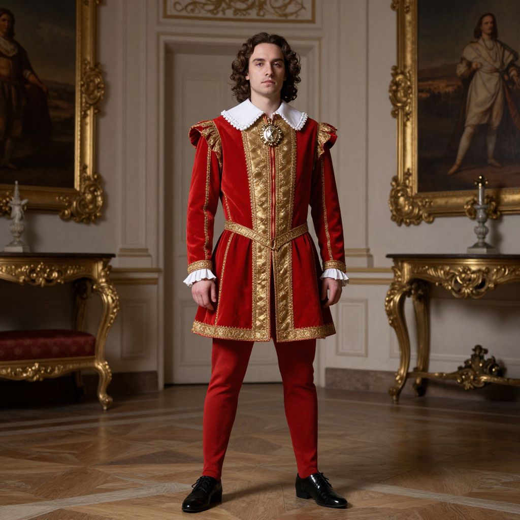 Photograph of a young man with curly brown hair standing in an opulent, classical-style room. He wears an elaborate, red velvet Renaissance-style outfit with gold embroidery, white lace collar, and white cuffs. The outfit includes a fitted bodice, long sleeves, and matching red pants. Black leather shoes complete the look. The background features ornate gold-framed paintings, a white-paneled wall, and gold-accented furniture with red velvet upholstery. The room's polished wooden floor adds to the luxurious ambiance. The man's expression is neutral, and he stands confidently at the center of the image.