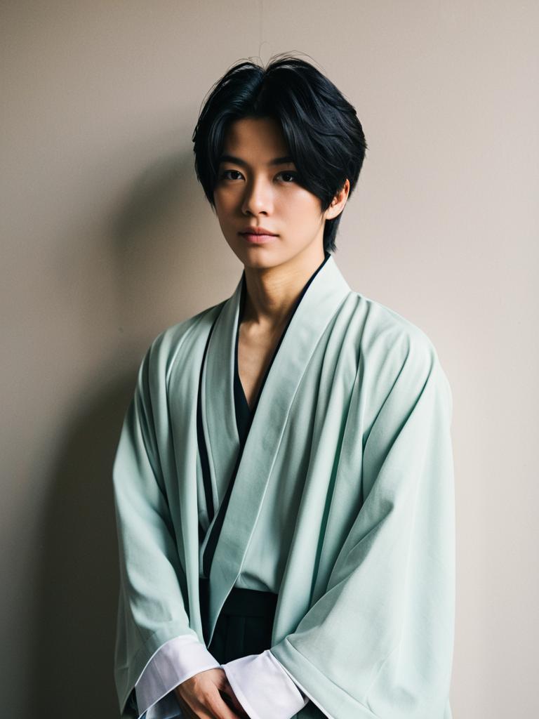 Portrait of a young Asian man wearing a realistic Supaidāman (Takuya Yamashiro) cosplay costume. The costume features a light green kimono-style top with wide sleeves and white cuffs, paired with a dark inner garment. He has short black hair styled neatly and poses against a plain beige background.