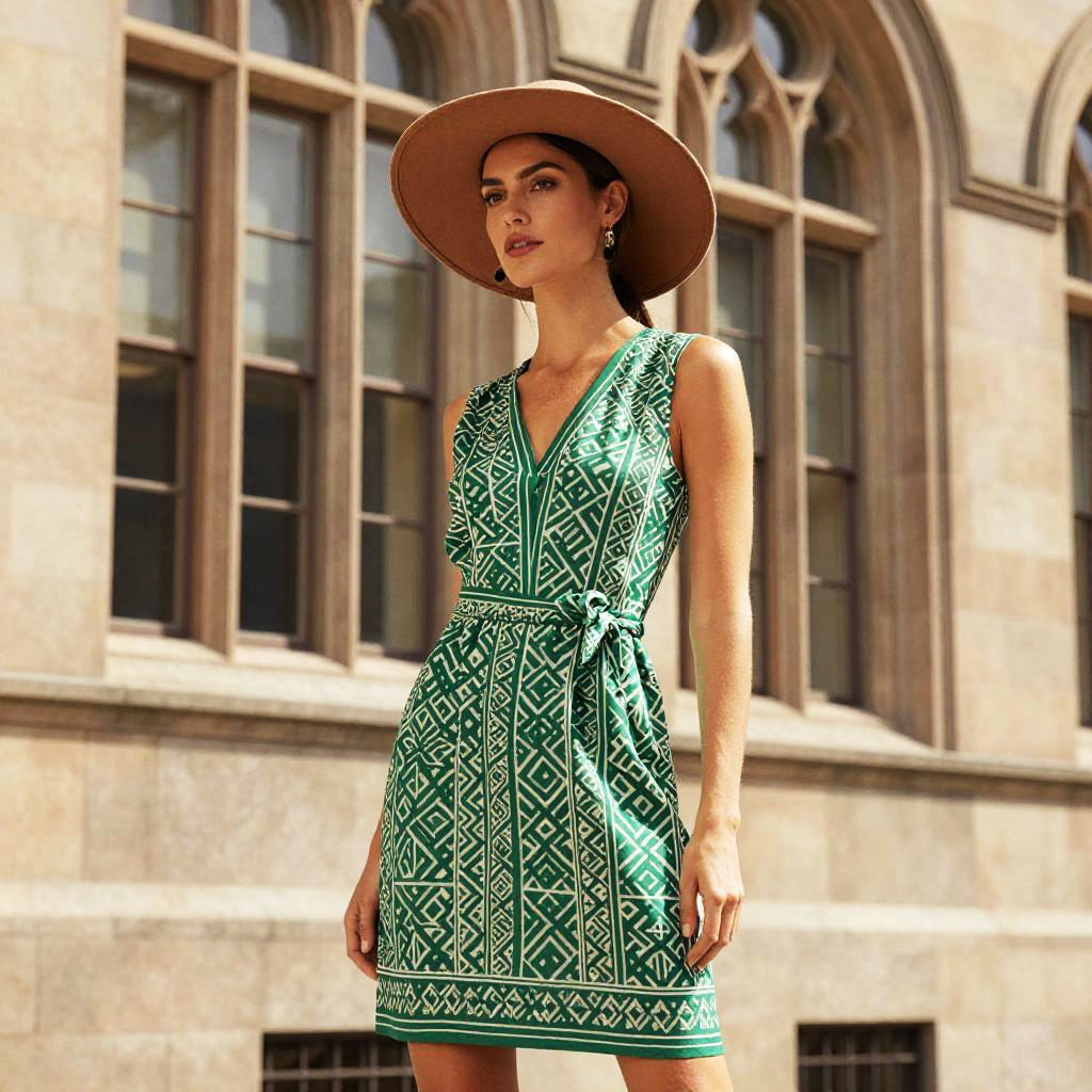 A young woman with long brown hair wearing a knee-length green dress and matching green sandals is standing outdoors on a tiled surface, holding a padel racket in one hand. She is posed in front of lush green foliage, creating a vibrant and natural background. The image combines casual fashion with a sporty element through the padel racket accessory.