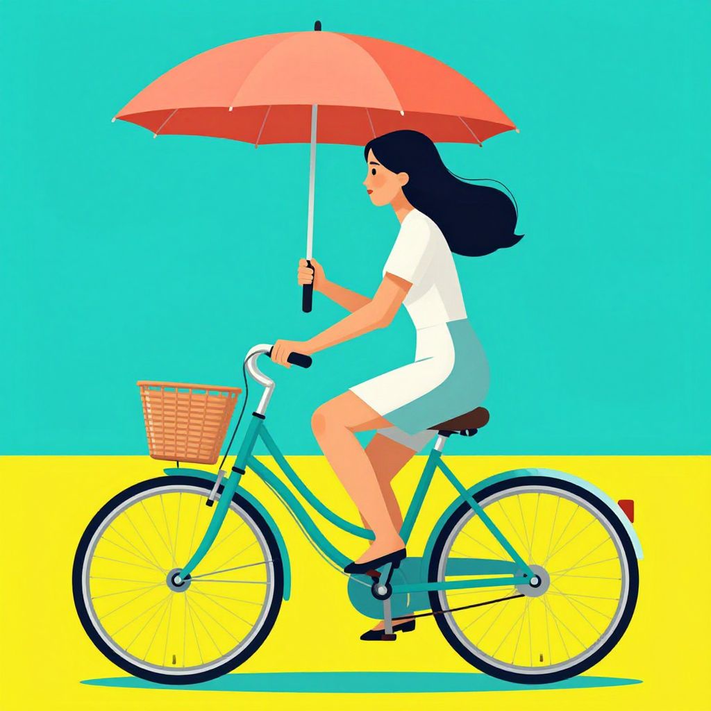 This digital illustration depicts a woman with long black hair riding a blue bicycle with yellow wheels on a yellow path against a bright blue background. She wears a white short-sleeve shirt and light blue shorts, and holds a red umbrella above her head. A brown basket is attached to the front of the bicycle. The woman's posture is upright, and she looks forward with a calm expression. The style is flat and colorful, with bold, solid colors and simple shapes, evoking a cheerful, summery vibe.