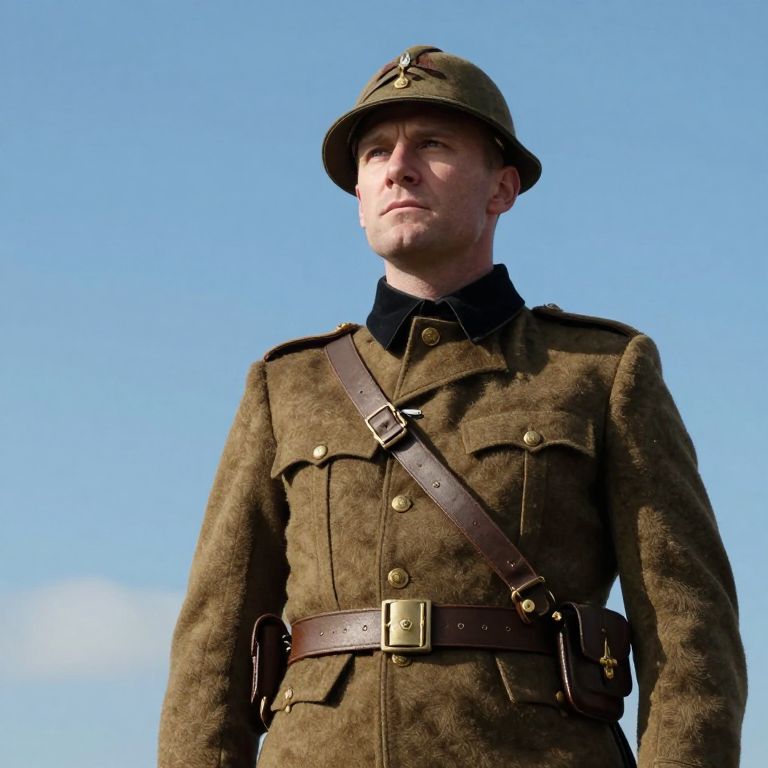 Photograph of a stern-looking white male soldier in a brown World War I-era military uniform and helmet, against a clear blue sky.