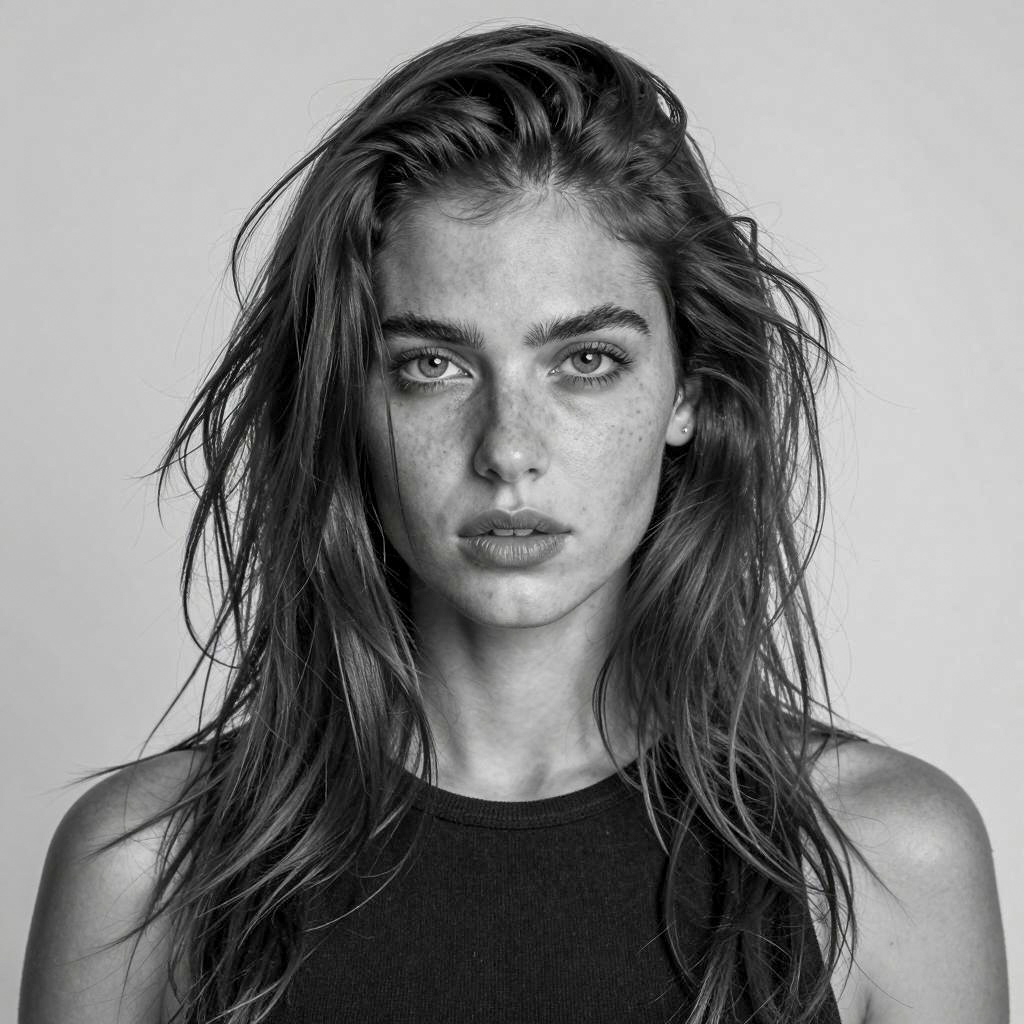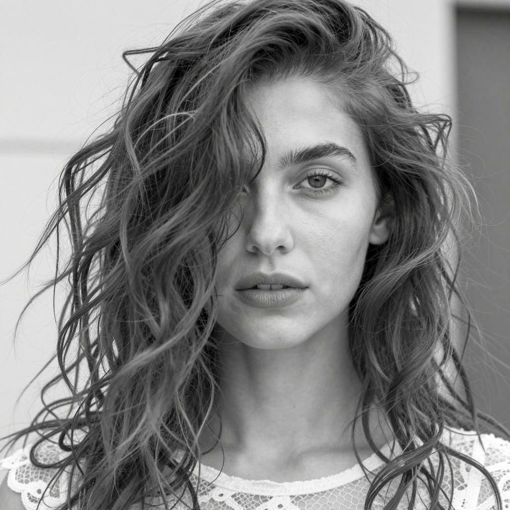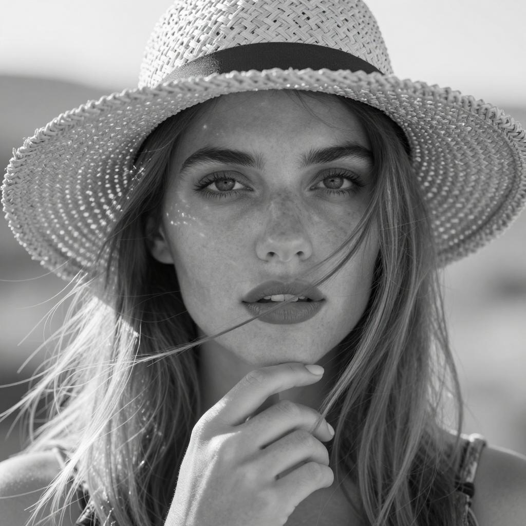 Black and white photograph of a woman with light skin and long hair. She wears a straw hat with windblown strands of hair across her face. Her right hand touches her chin, with fingers slightly curled. She has full lips and intense, slightly parted eyes. Her gaze is directed slightly upward. The background is blurred, focusing on her face and hat.