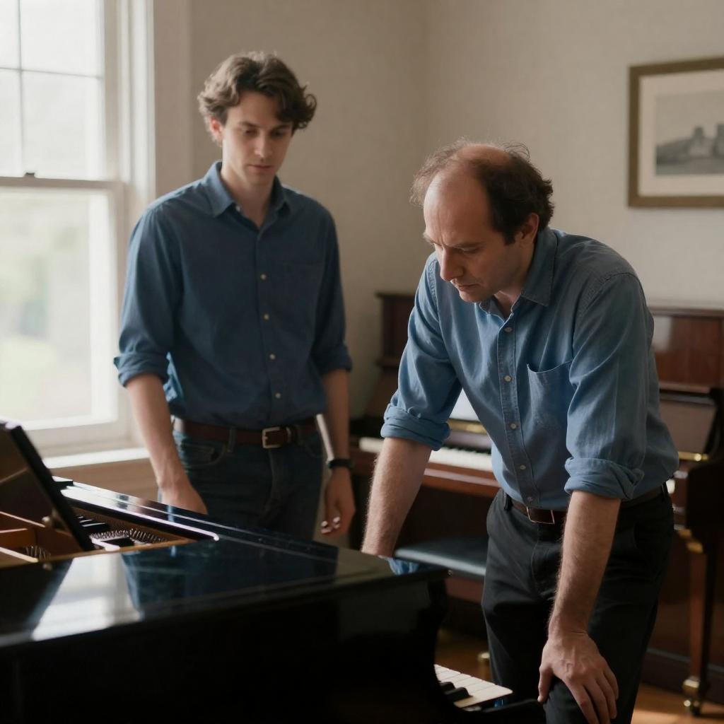 Two men in a room. One man with receding hair, wearing a blue shirt, stands near a window. The other man, also with receding hair, wearing a blue shirt, leans over a black grand piano, concentrating. Sunlight streams through the window. Piano's curved top and wooden finish are visible. The background includes a beige wall and a framed picture. Both men have focused expressions. The scene is lit with natural light.