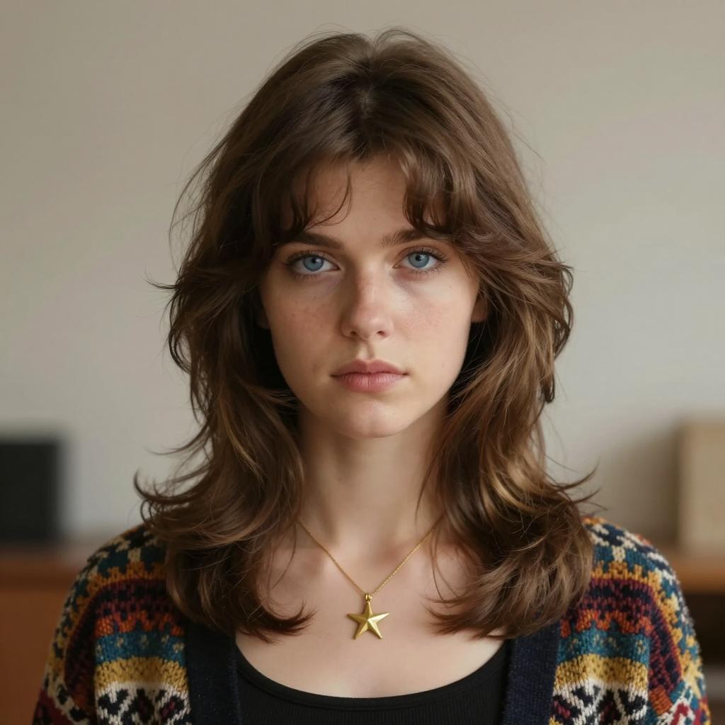 Photorealistic portrait of a young woman with wavy brown shag haircut and blue eyes. She wears a black top layered with a multicolored patterned cardigan and a gold necklace featuring a star pendant. The image showcases soft lighting, subtle shadows, and a 1970s-inspired hairstyle with natural makeup in a warm-toned, blurred background.