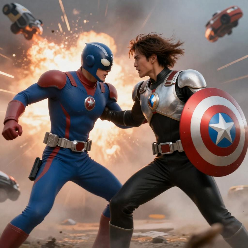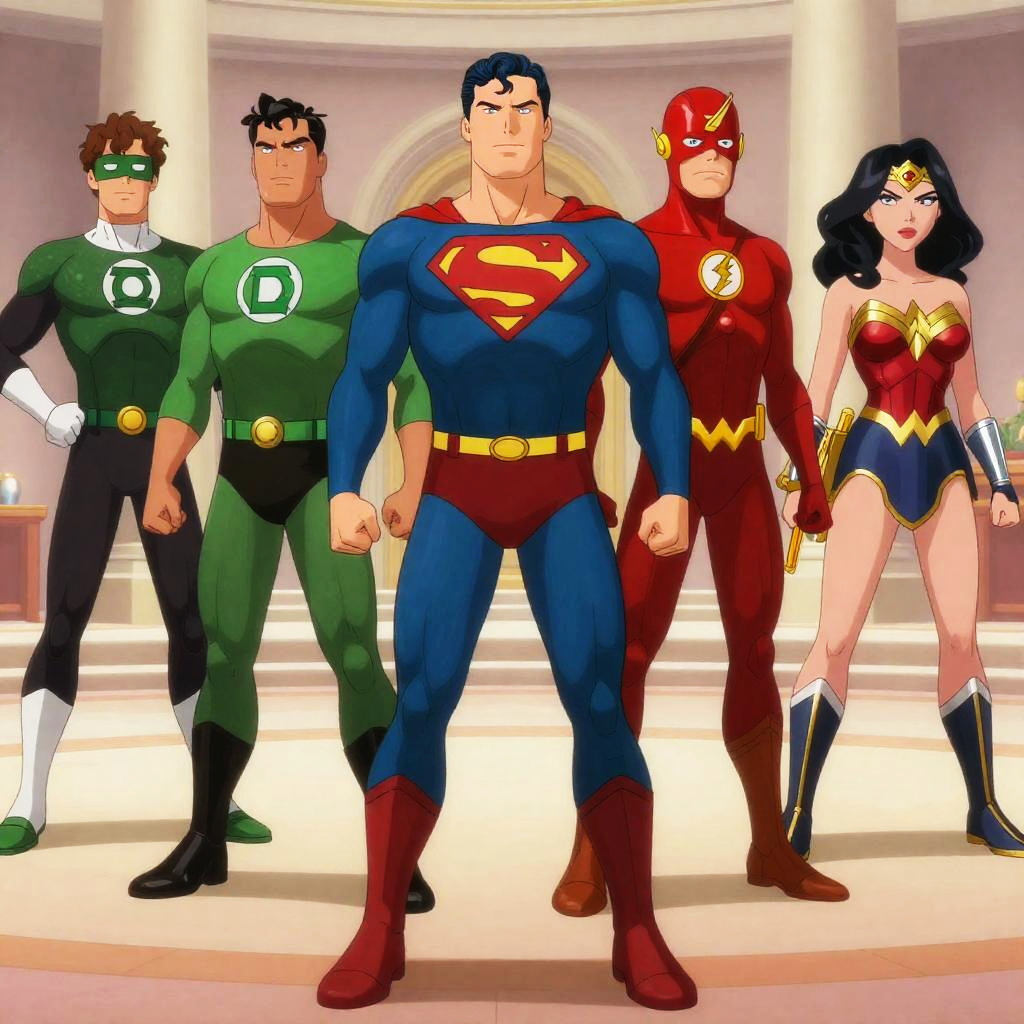 Digital illustration of eight superhero-like figures in a row, each with unique armor and colors. Background features cracked walls and a large statue. Figures stand with varied poses, showing intense facial expressions. Colors include red, green, black, and gray. Textures are metallic and rugged. Figures have horns, claws, and varying armor designs.