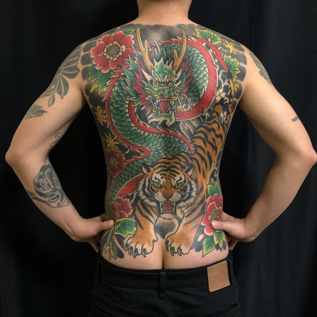 Photograph of a tattooed man from behind, featuring a vibrant red and yellow dragon with floral patterns and clouds on his back and arms.
