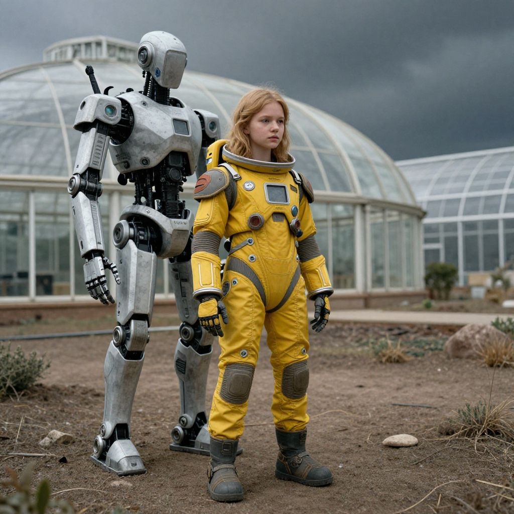 Photograph of a blonde girl in a yellow spacesuit standing beside a silver robot, in front of a glass greenhouse with a stormy sky background.