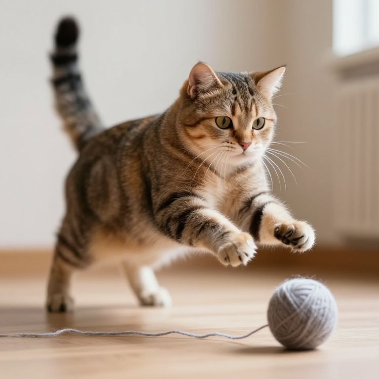 A cat pouncing on a ball of yarn, captured in slow motion with its claws extended and the yarn suspended mid-air, showcasing the precision and motion of the leap.
