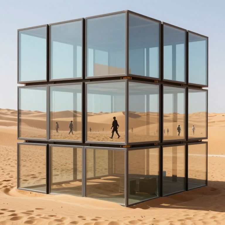 A digital CGI image depicts a modern, glass cube structure with six transparent panels standing in a vast, sandy desert. Inside the cube, several small, silhouetted figures walk, appearing as if they're inside a larger, transparent world. The clear glass panels reflect the sunny, undulating sand dunes in the background. The cube's minimalist design contrasts starkly with the expansive, golden desert surrounding it. The figures within are varied in size but indistinguishable in detail, adding a surreal, abstract element to the composition.