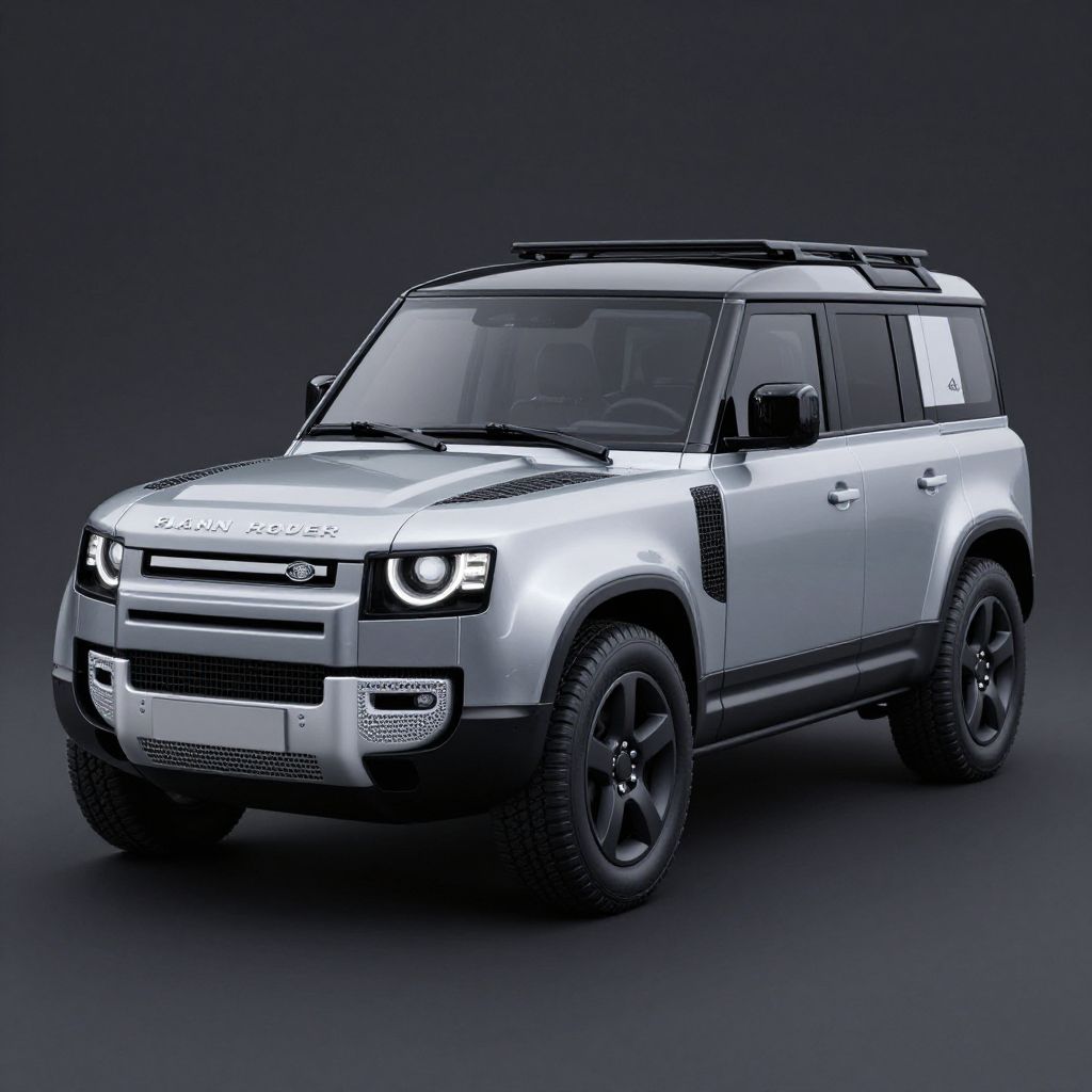 A sleek 3D-rendered depiction of a Kahn Land Rover Defender RC model showcases its rugged design with high-definition details, dramatic lighting, and a polished finish that makes it appear as real as possible.