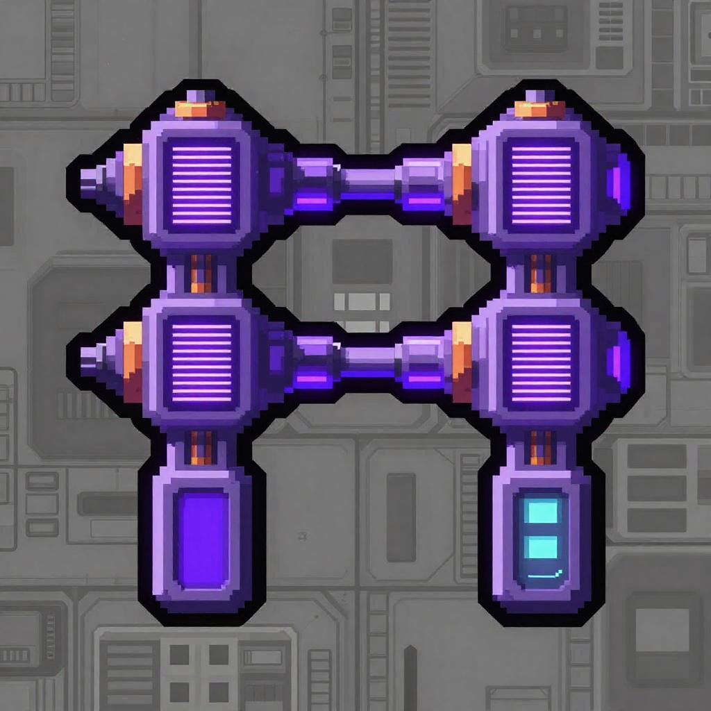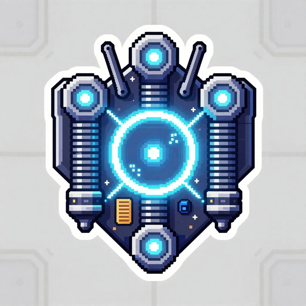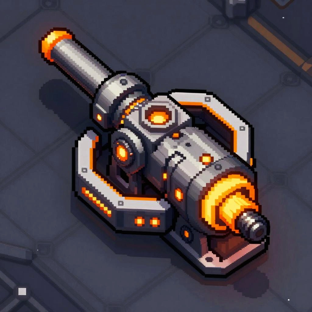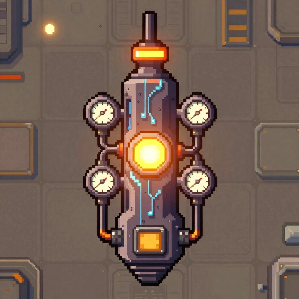 2D thermal plasma projector sprite design, top-down view, futuristic sci-fi style, detailed coolant veins, pressure gauges rendered with crisp pixel art, glowing glowing amber accents, vibrant palette, strong silhouette, modular panels, high-contrast shading, clean outline, seamless tiling ready, set against a neutral starship deck, game asset concept