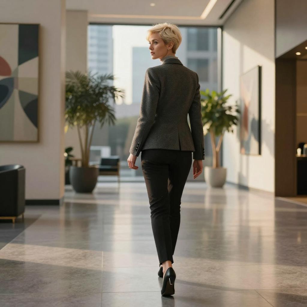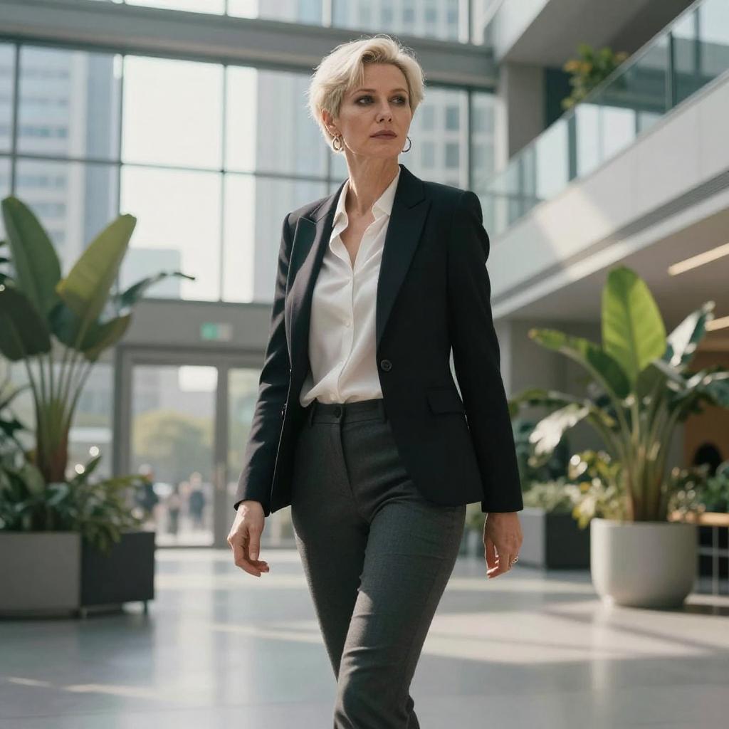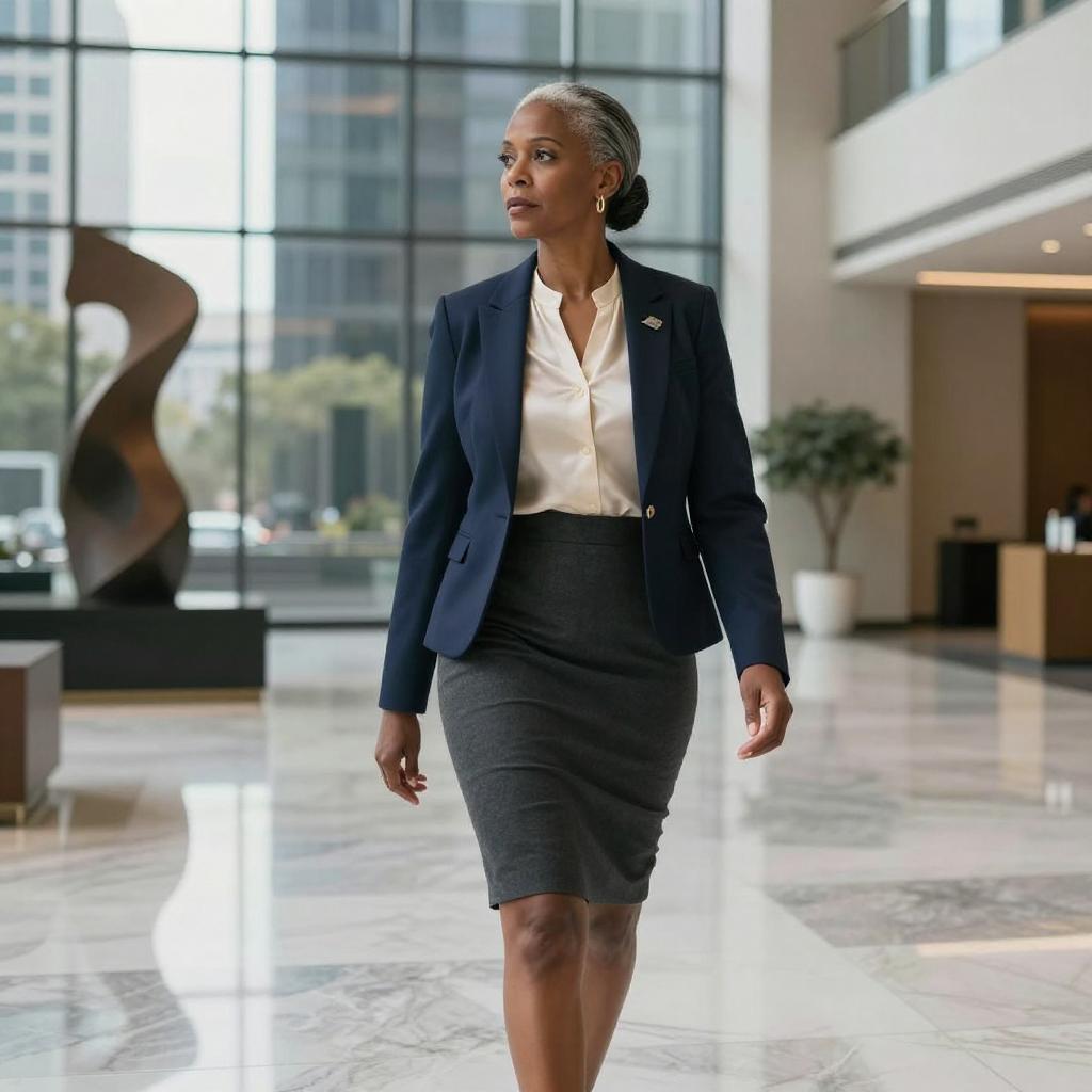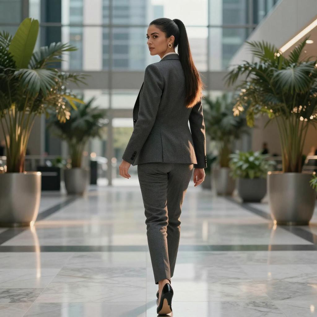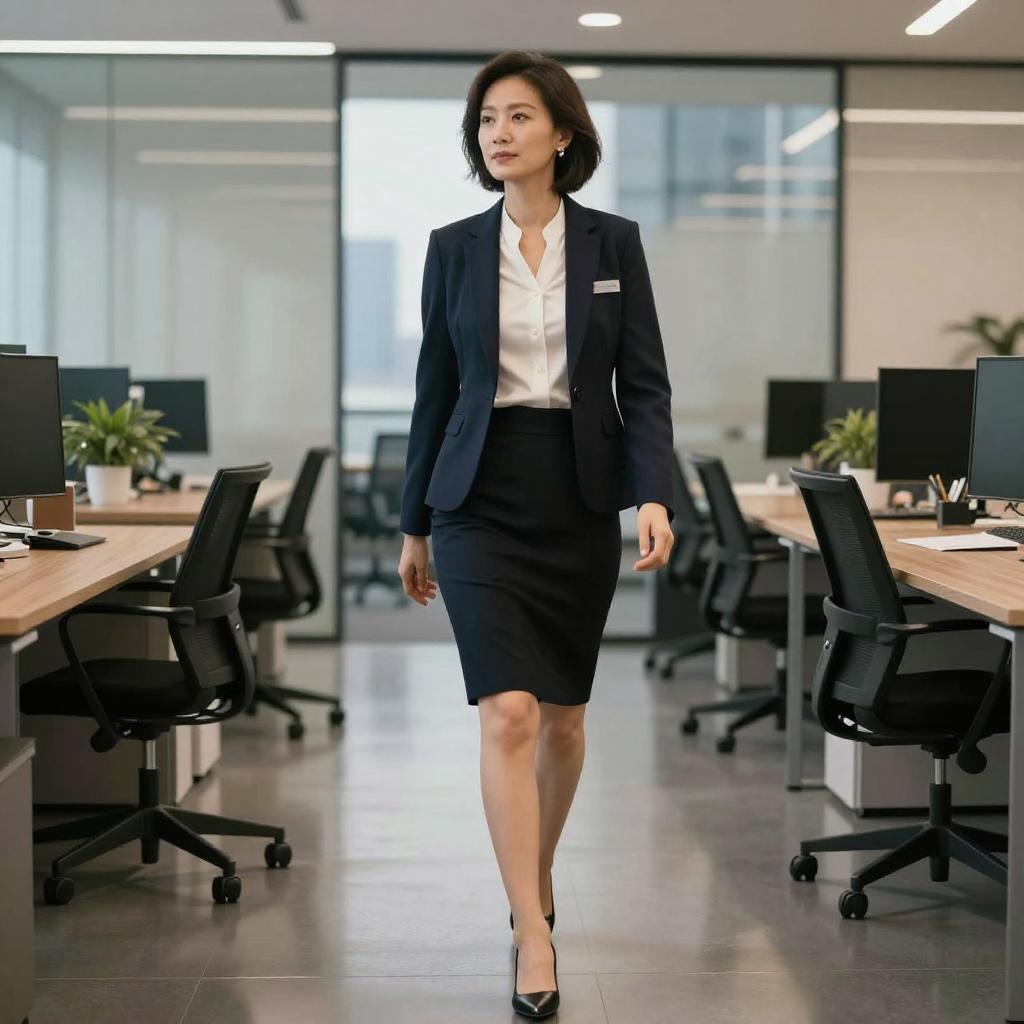 Mature Asian CEO, late 40s, confident, sleek dark bob, subtle professional makeup, light reading glasses, poised posture, glancing over shoulder walking through a modern glass atrium with steel beams and lush green plants, soft bokeh, sharp focus, dynamic perspective from back, glancing over shoulder at viewer, reflective floor, corporate skyline beyond, detailed background, hyperrealistic, masterpiece, best quality, intricate detail, cinematic light, volumetric rim light, sharp focus, soft bokeh, dynamic perspective from back, 1woman adult, beautiful detailed eyes, perfect hands, detailed fingers, rim light, natural color, confident stride, tailored charcoal blazer, crisp white silk blouse, high-waisted charcoal pencil skirt, sheer nude stockings, low-heeled black pumps, delicate pearl earrings, engraved silver nametag, thin leather belt