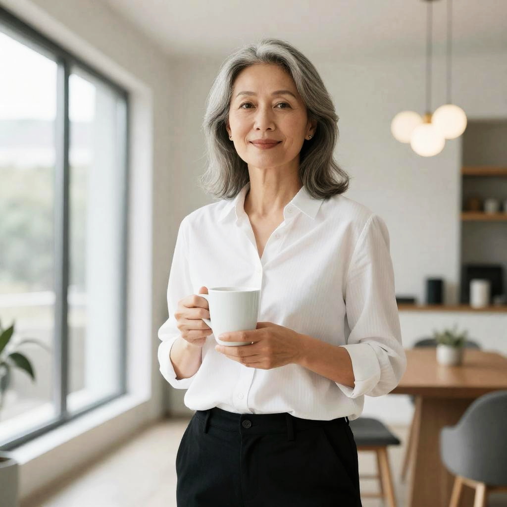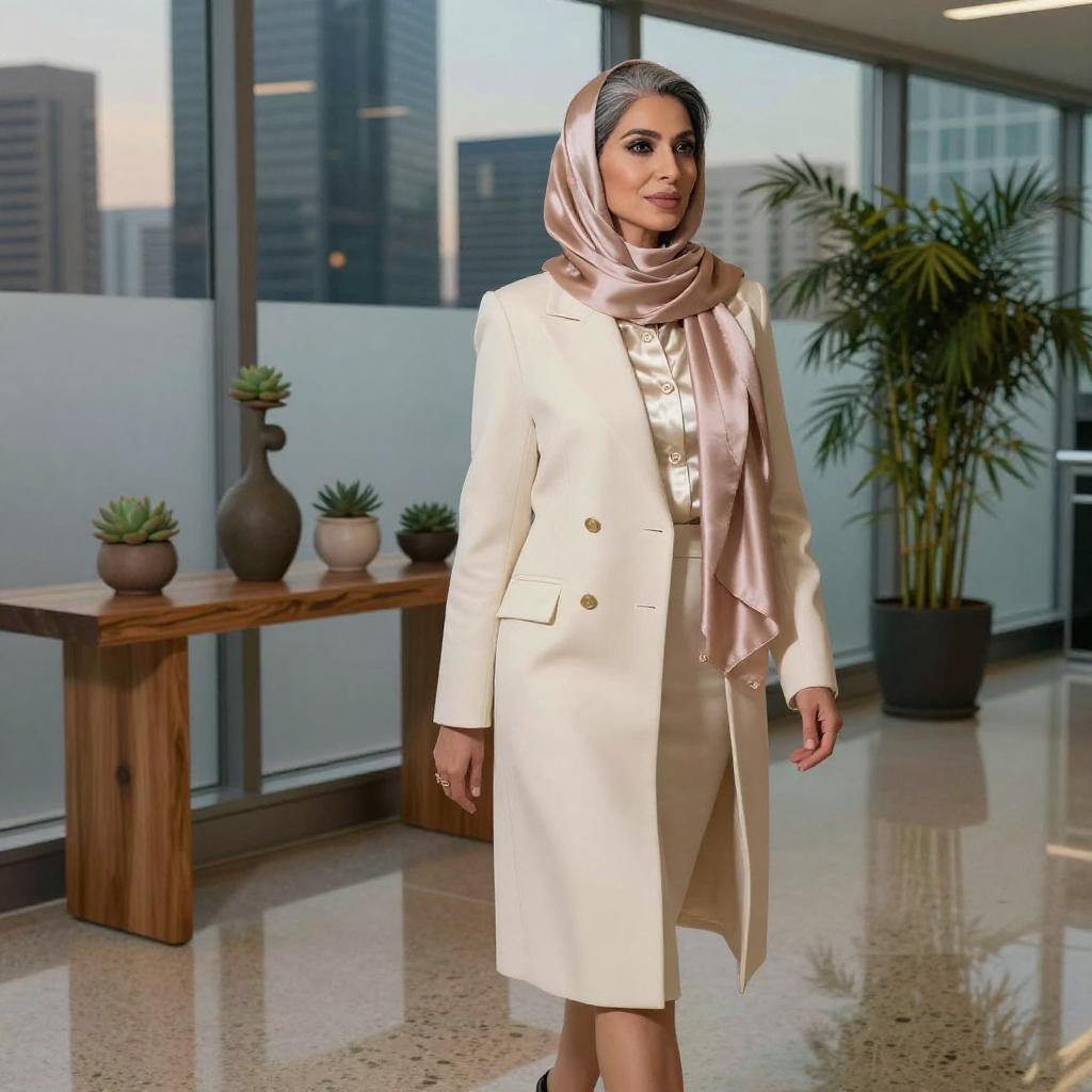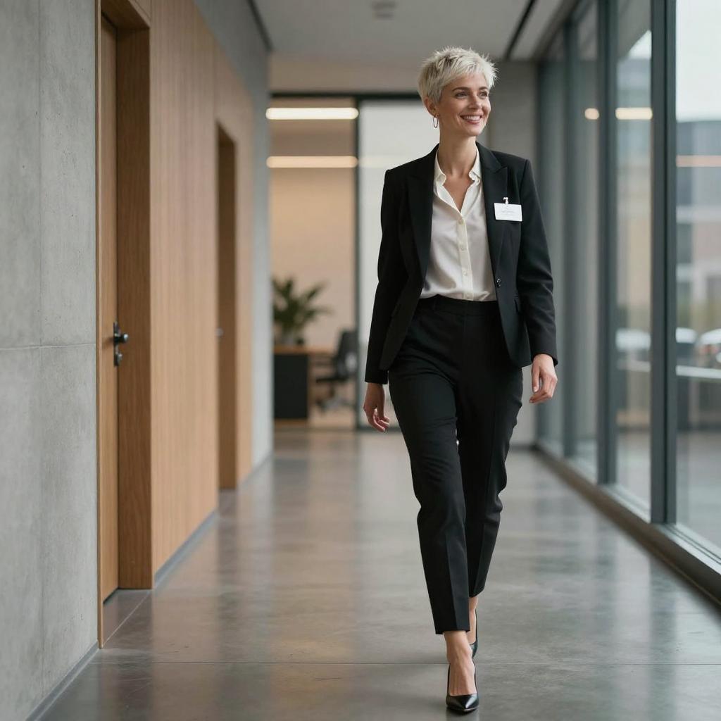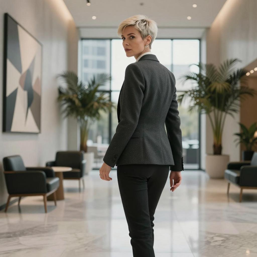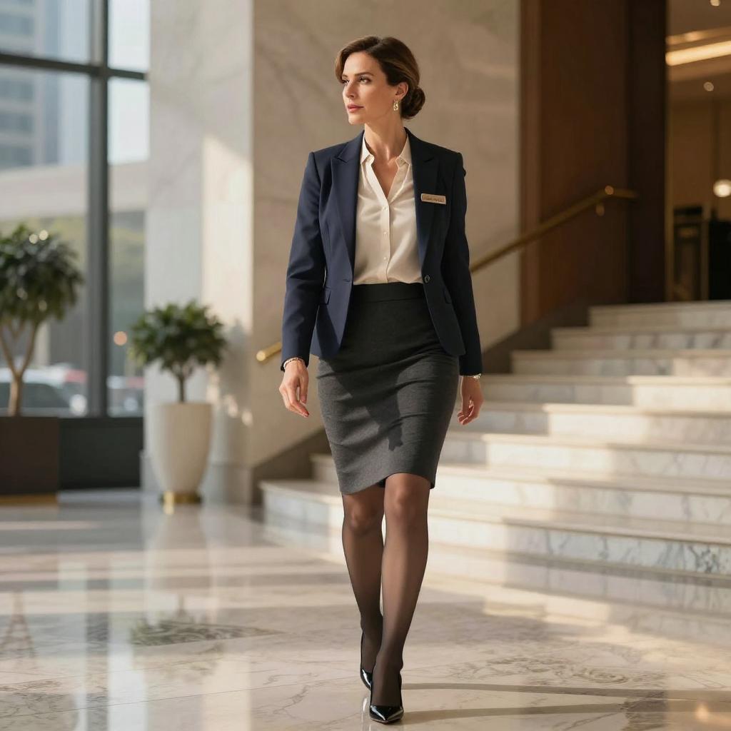 Mature Asian CEO, late 40s, confident, sleek dark bob, subtle professional makeup, light reading glasses, poised posture, glancing over shoulder walking through a modern glass atrium with steel beams and lush green plants, soft bokeh, sharp focus, dynamic perspective from back, glancing over shoulder at viewer, reflective floor, corporate skyline beyond, detailed background, hyperrealistic, masterpiece, best quality, intricate detail, cinematic light, volumetric rim light, sharp focus, soft bokeh, dynamic perspective from back, 1woman adult, beautiful detailed eyes, perfect hands, detailed fingers, rim light, natural color, confident stride, tailored charcoal blazer, crisp white silk blouse, high-waisted charcoal pencil skirt, sheer nude stockings, low-heeled black pumps, delicate pearl earrings, engraved silver nametag, thin leather belt