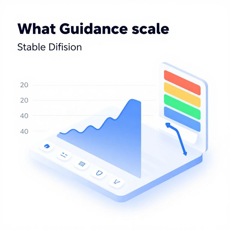 An infographic style image illustrating what guidance scale does stable diffusion, colorful graphs, digital interface with floating controls, clean minimalistic style