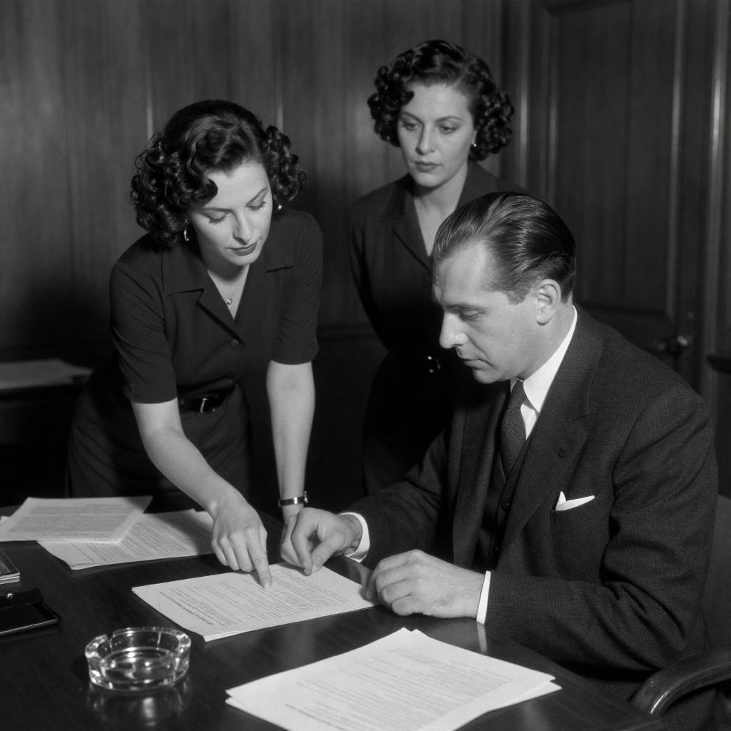 Black-and-white photograph of three people in a dimly lit, wood-paneled room. A man with slicked-back hair and a dark suit sits at a desk, looking at papers. A woman with curly hair and a dark dress stands beside him, pointing at the papers. Another woman with curly hair and a dark dress stands behind them, observing. The desk has scattered papers and a glass ashtray.
