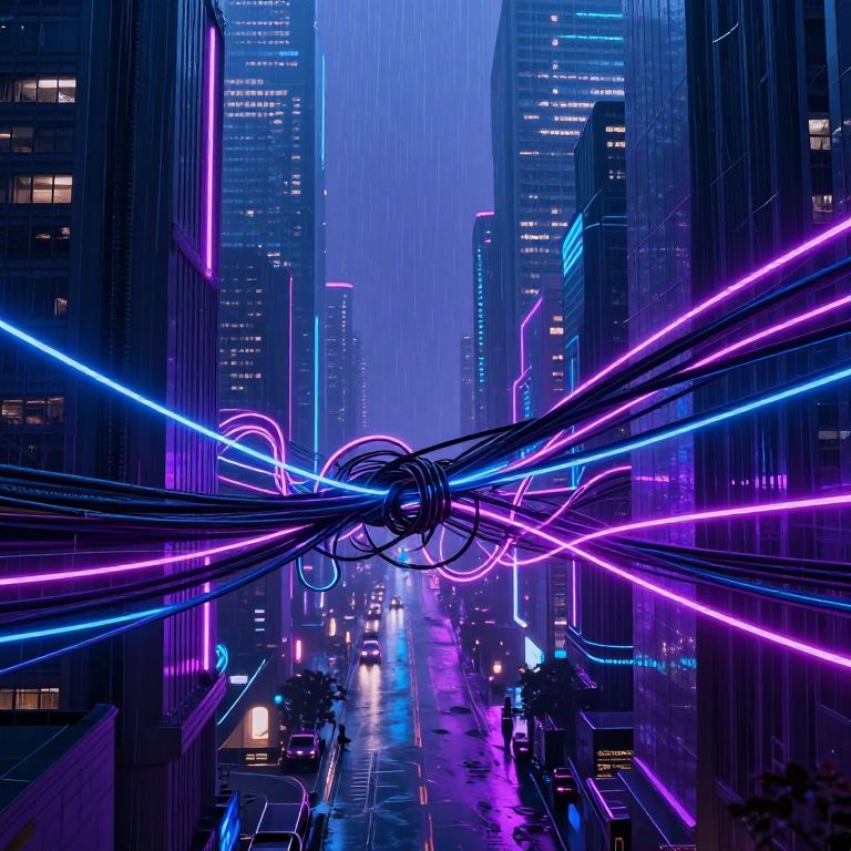 Cables entangled in a futuristic cityscape, glowing neon wires twisting and weaving between skyscrapers, high-tech cyberpunk atmosphere with vibrant purple and blue hues, rain-soaked streets reflecting the colorful light, digital rain falling in background