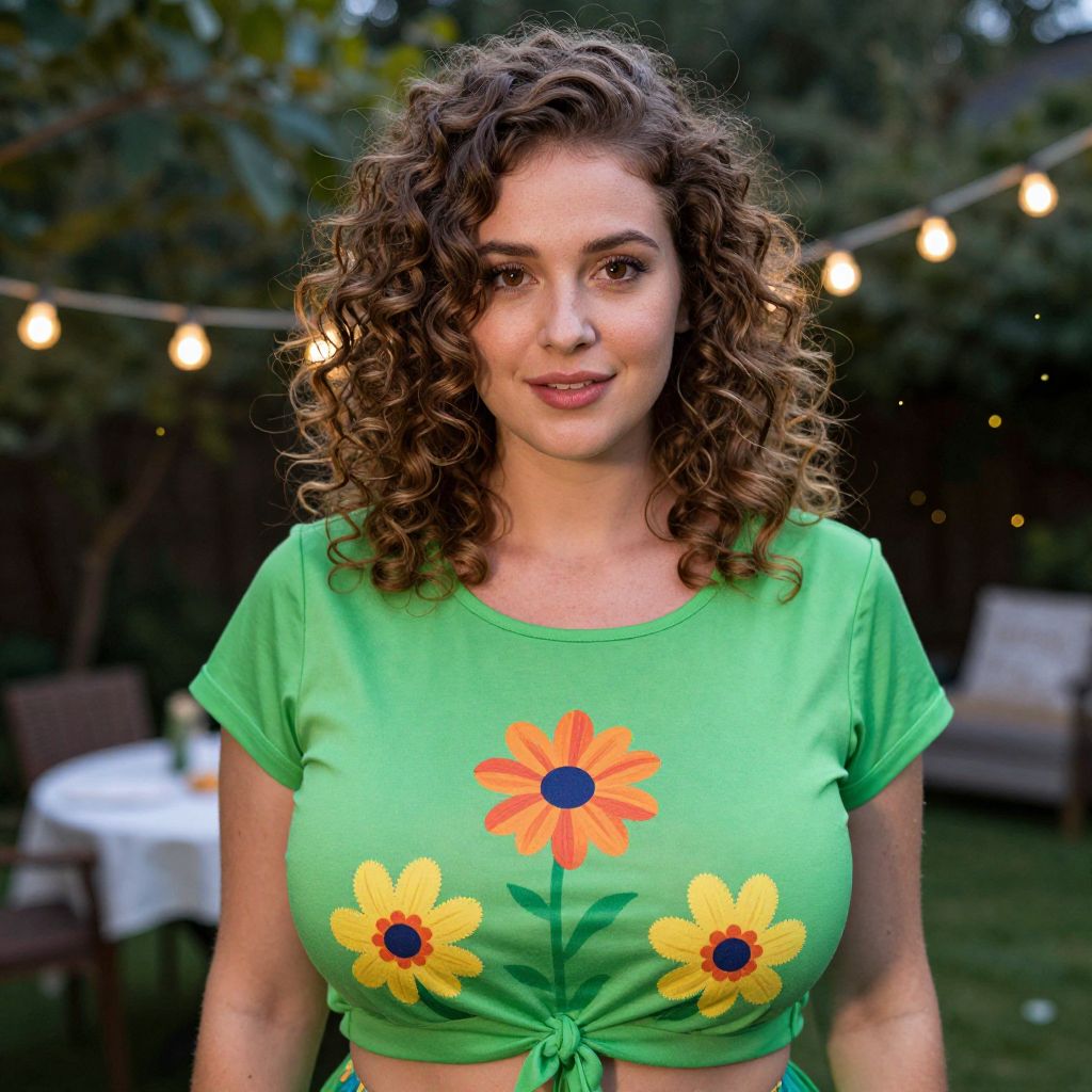 A realistic photography of a young woman in her late 20s with curly brown hair and warm brown eyes wearing a bright green party top as part of a festive costume, standing in a cozy backyard during a summer evening with string lights and fireflies in the background, the green top has bold floral patterns and a slightly loose fit. The woman has big tits and cute face