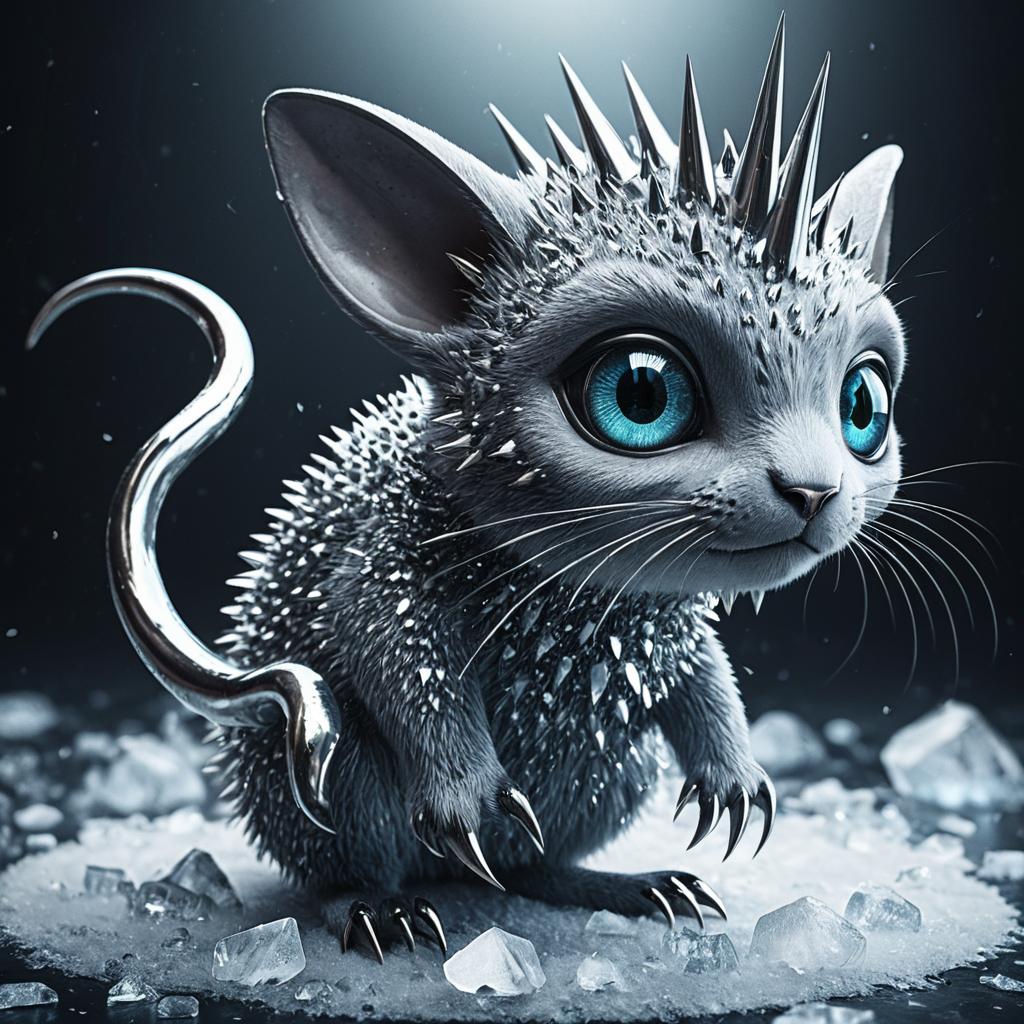 A hyper-realistic digital rendering of a small silver creature with a cylindrical glossy body. It features large oval blue eyes, rounded ears, a thin whip-like tail, and is covered in sharp crystal spikes. The creature is surrounded by ice shards, rendered with sharp focus in a studio setting, emphasizing intricate details and a whimsical appearance.