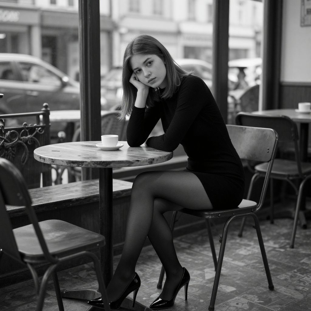 This black-and-white photograph captures a young woman seated at a small round table in a cozy cafe setting, She is positioned slightly off-center to the right, with her left elbow resting on the table and her head propped up on her hand, giving her a contemplative, pensive expression, Her hair is straight and falls just below her shoulders, framing her face, She is wearing a form-fitting, long-sleeved black dress that accentuates her slender physique, paired with opaque black tights and glossy black high-heeled shoes, The table in front of her is simple, with a small white cup or saucer, likely for a beverage, placed on it, The cafe's interior features a rustic charm, with metal folding chairs and a wooden table with a worn finish, The background shows the glass front of the cafe, revealing a blurred street scene with parked cars and other indistinct objects, suggesting a bustling urban environment, The lighting is soft, likely natural, creating gentle shadows and highlights that enhance the textures of her clothing and the cafe's surfaces, The overall atmosphere is intimate and reflective, with a touch of melancholy due to the monochrome palette