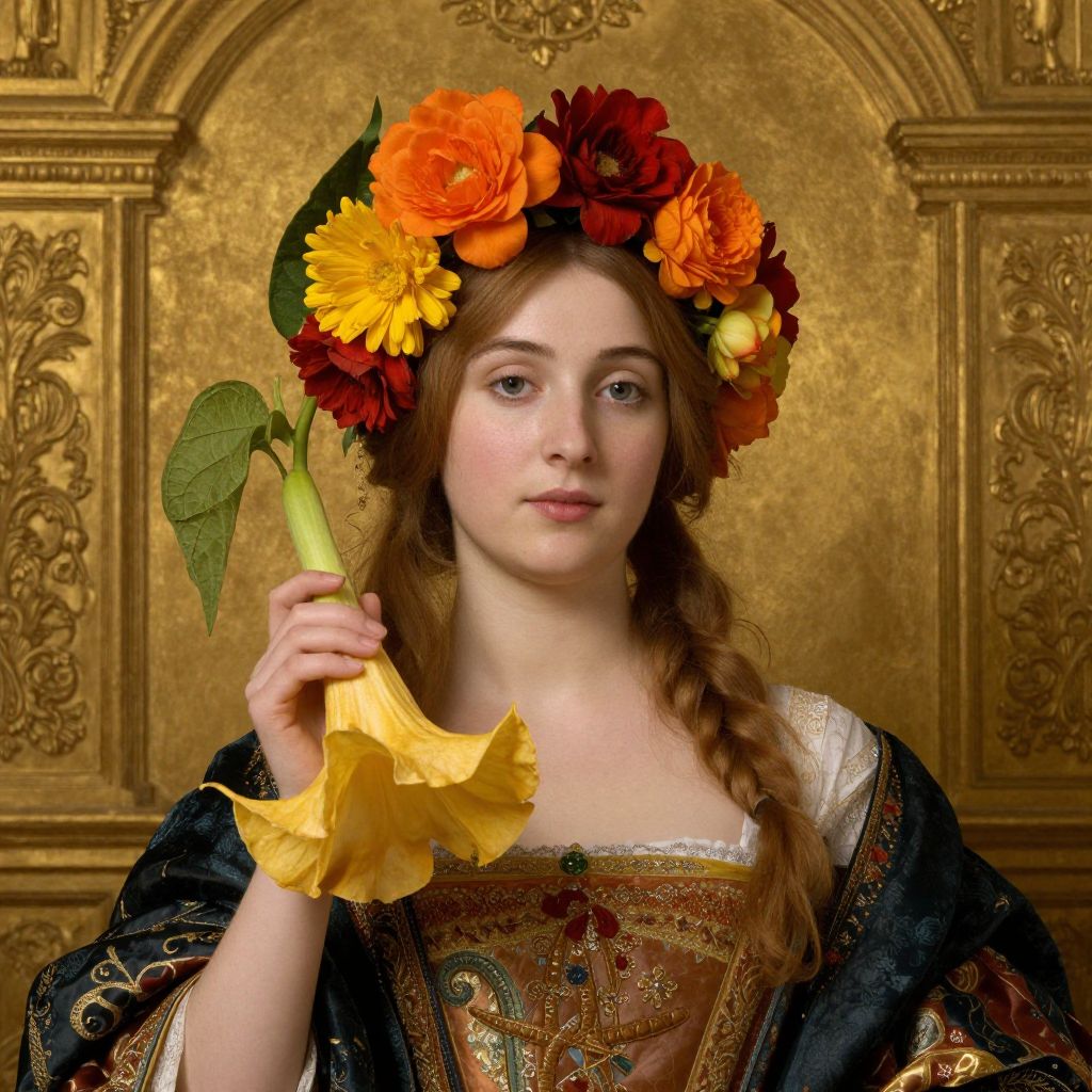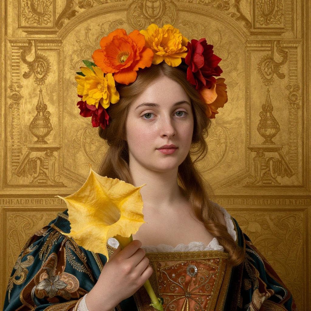 Fred Wessel's 'Venetian Icon' portrays a woman adorned with vibrant orange, red, and yellow flowers in her hair, holding a large yellow Angel's Trumpet flower, set against a richly detailed golden background and dressed in ornate attire.