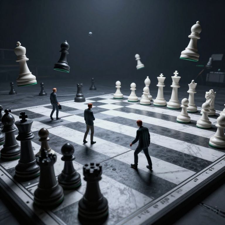 A digitally created, surreal image depicts three men in dark suits playing a giant chess game on a black-and-white checkered board. The scene is illuminated by a spotlight from above, casting dramatic shadows. Large chess pieces, both black and white, are mid-air or standing on the board. The background is a dark, gradient blue, enhancing the focus on the illuminated board and figures. The men's silhouettes are sharp, adding a sense of motion and urgency. The image combines elements of realism with hyper-stylization, creating a dynamic and intense atmosphere.
