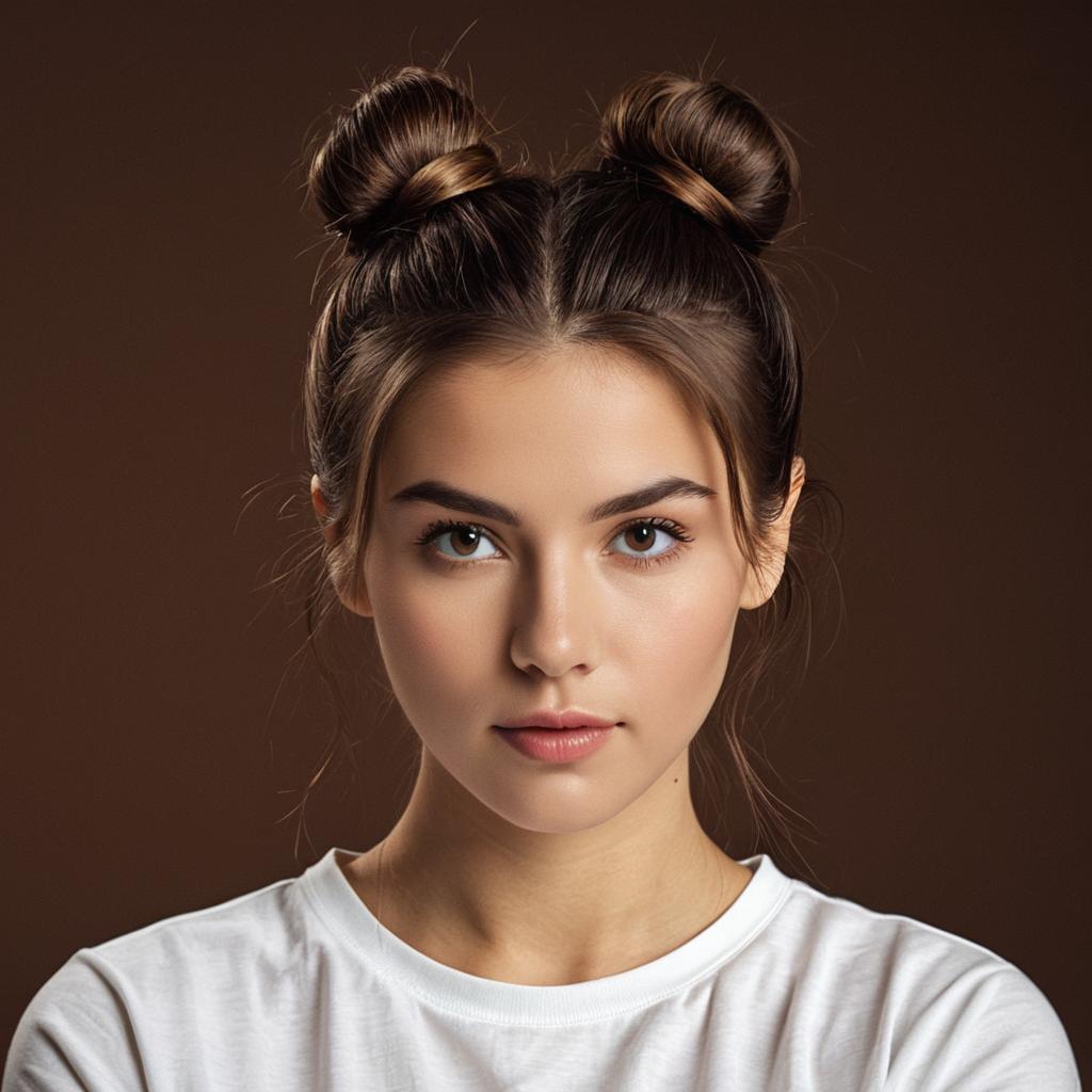 Portrait of a young woman with brown hair styled in two space buns. She is wearing a plain white shirt and has a neutral expression with closed lips. The background is a solid brown color, emphasizing her facial features and hairstyle.
