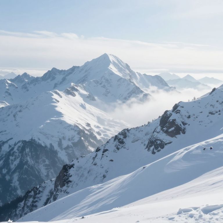 Photograph of a snowy mountain range under a bright, clear sky. The image showcases jagged, white-capped peaks with some darker, rocky outcrops. Sunlight illuminates the upper mountain, casting shadows on the lower slopes. A thin layer of mist or low clouds hovers around the midsection of the mountain. The foreground features smooth, undisturbed snow, while the background displays craggy, textured rocks. The overall color palette is predominantly white and blue, with the sunlight adding a stark contrast to the darker rock formations. The scene evokes a sense of cold, serene wilderness.