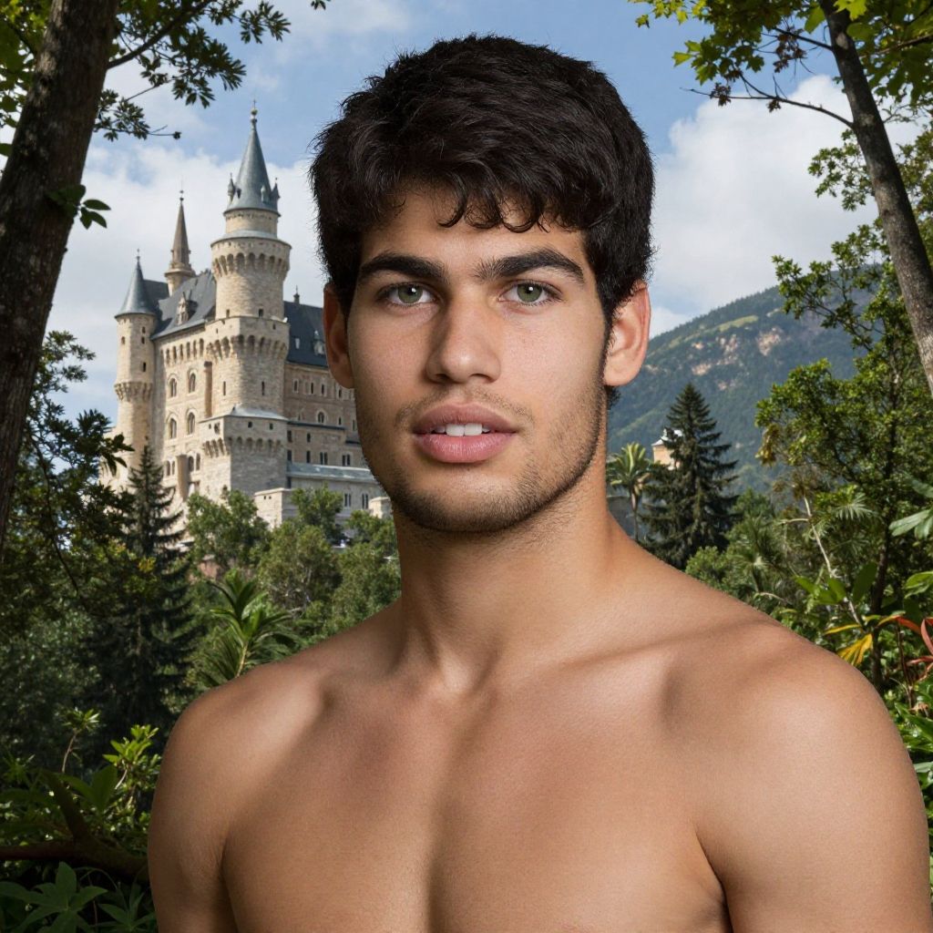 Carlos Alcaraz men 20 years old middle age, shirtless, green eye, black curls, in forest, castle in background, ultra realistic, canon 5d brand, real hair, incredible colorBackground full of details 8k