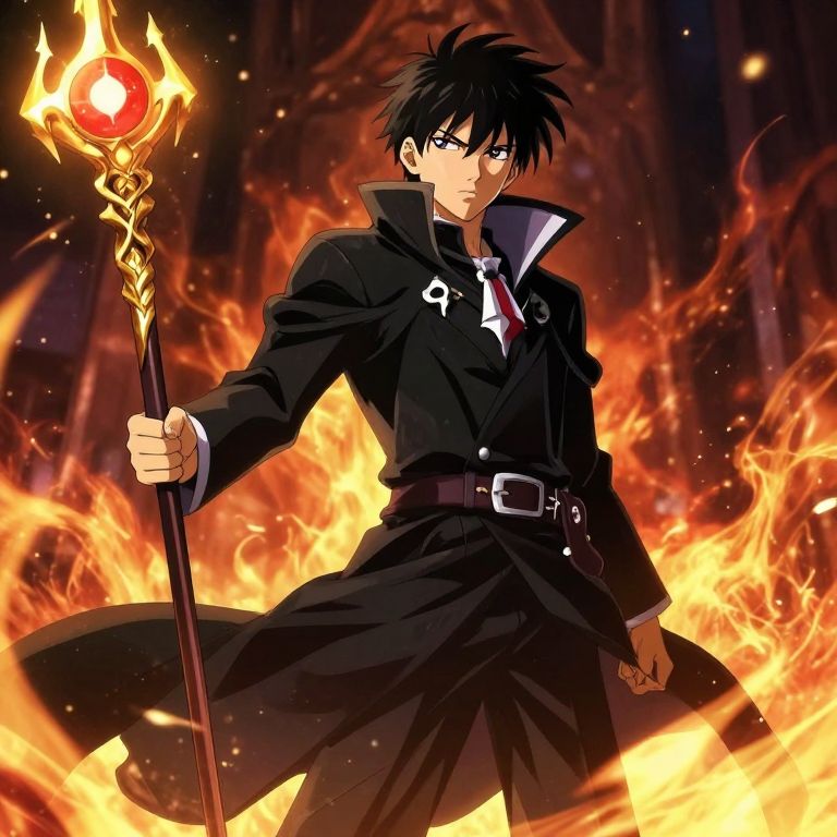 A beautifully illustrated, highly detailed anime character, dressed as a black mage, wields a glowing staff amidst a dramatic, fiery background.