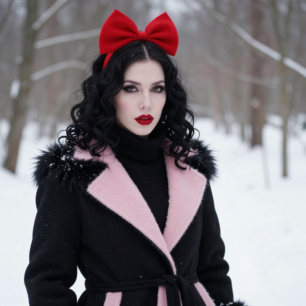 Photograph of a striking woman with pale skin and dark, wavy hair, standing in a snowy forest. She wears a black coat with pink lining, fluffy black trim, and a red bow on her head. Her red lipstick matches the pink details on her coat. She has bold makeup, including dark eyeliner and red lips. Snow blankets the ground, and bare trees create a wintry backdrop.