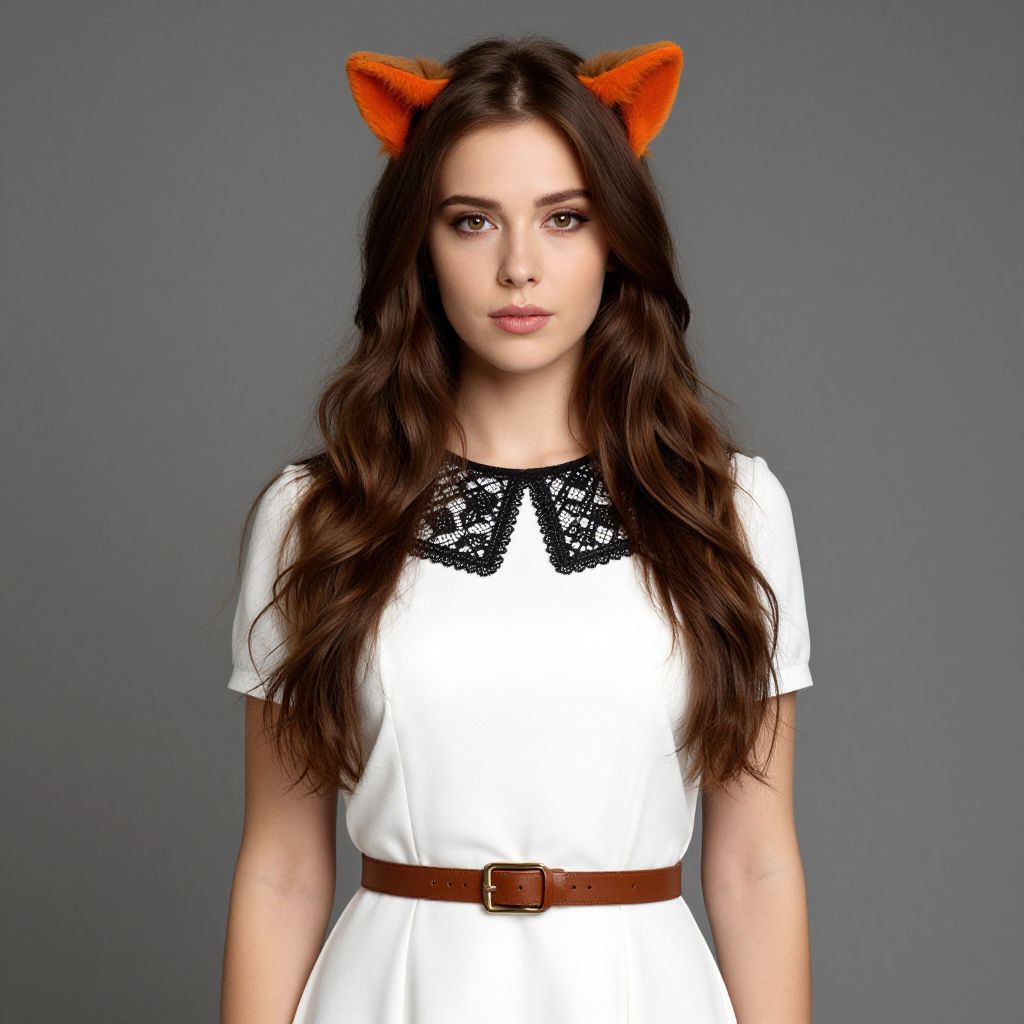 Photograph of a young woman with long, wavy dark brown hair and fair skin. She wears a white dress with a black lace collar and a brown belt, and has orange, furry cat ears on her head. Her expression is neutral, and she gazes directly at the camera. The background is a solid, muted gray, making her white dress and orange cat ears stand out prominently. Her makeup is natural, with a focus on her eyes. The overall style is playful and whimsical, blending casual clothing with a fun, fantasy element.