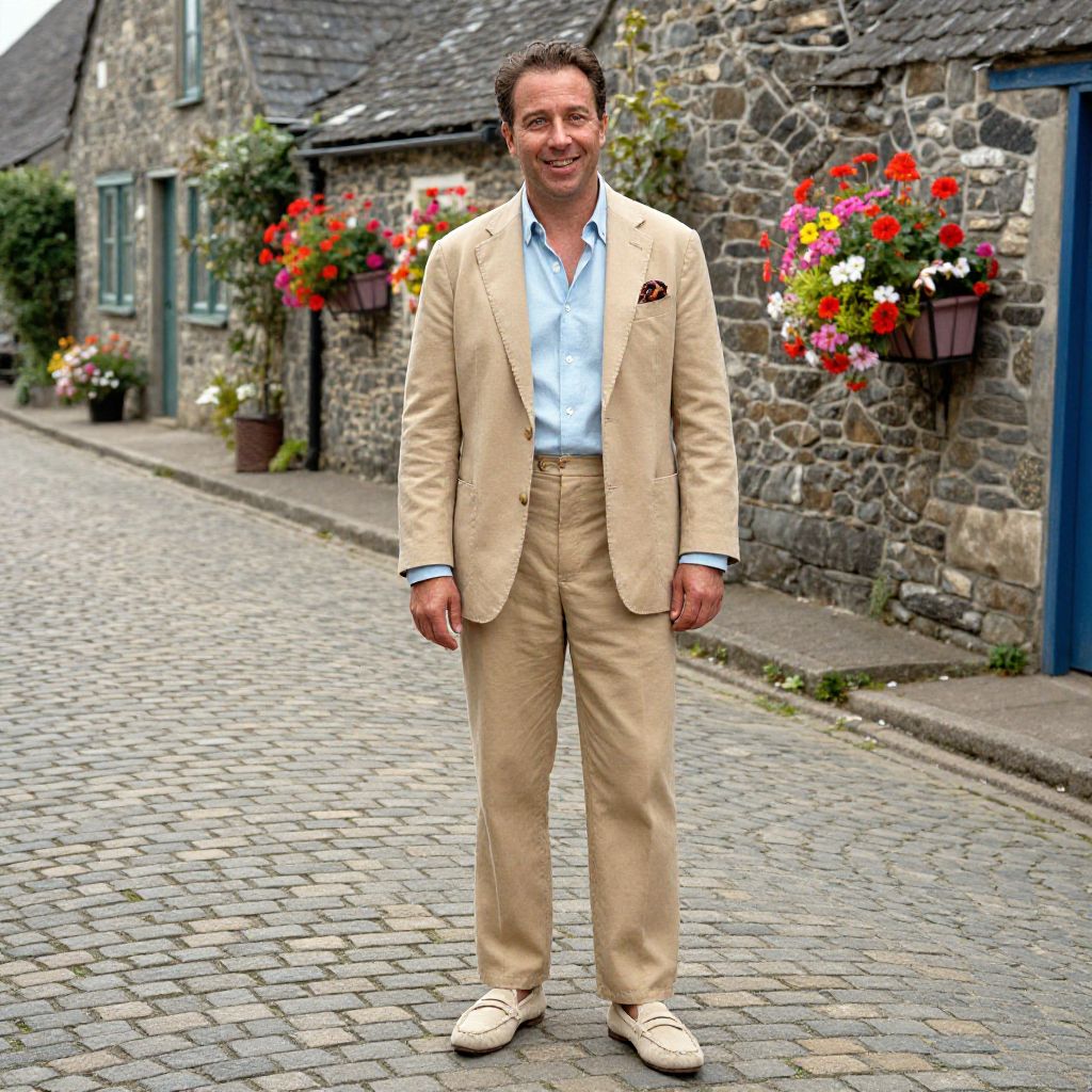 A man, tan cotton suit, pastel blue chambray shirt, beige loafers, patterned silk pocket square, modern fit, charming cobblestone streets, vibrant flower boxes, rustic stone cottages, kodak sp analog photo, relaxed smile, warm and inviting expression. Man has masculine face and piercing eyes