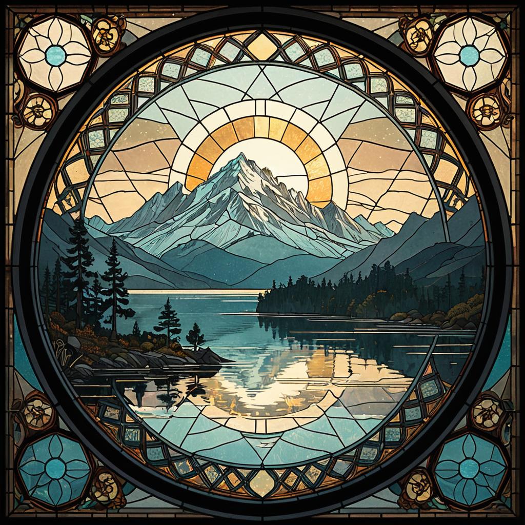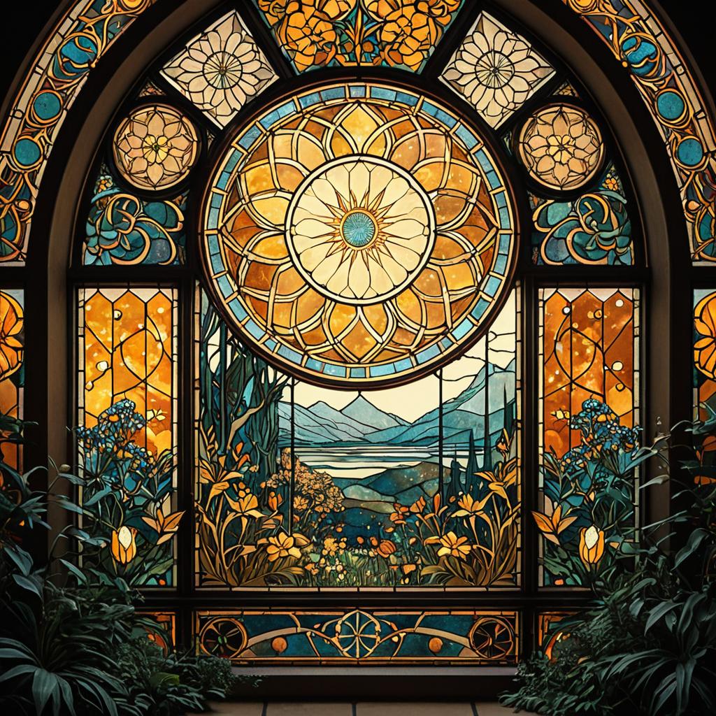 A hexagonal stained glass window featuring a romantic celestial garden design. The artwork includes intricate geometric filigree inspired by Alphonse Mucha and David Zapora, rendered in warm amber and turquoise hues. Detailed floral motifs and a radiant glowing sunburst pattern are centered against a backdrop of mountains and water, showcasing a beautifully composed, high-detailed style reminiscent of Studio Ghibli.